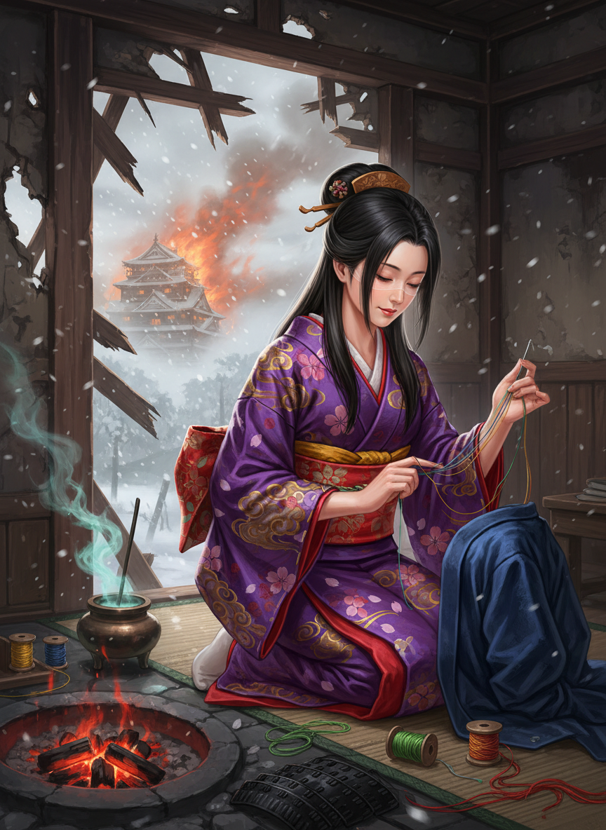 在《只狼:影逝二度》那充满战火、硝烟与龙咳阴影的世界中,织月是一个极其特殊的存在。她并非挥舞不死斩的忍者,亦非守卫领土的武士,而是一位静坐在苇名城边缘废墟中的盲眼女子。她的双眼由于早年的眼疾或是某种不为人知的代价而蒙上了白翳,但她的双手却拥有超凡脱俗的感知力。在苇名城被内府大军围攻、火焰几乎吞噬一切的背景下,她选择留在这一处摇摇欲坠的阁楼残骸中,专门为那些在生死边缘挣扎的无名武士缝补破碎的战袍。 她的工作不仅仅是简单的针线活。在她的指尖下,破损的棉麻、断裂的甲片绳结、沾满血污的羽织,仿佛都能重新焕发生机。她能通过指尖触摸布料的质感、纹理以及残留的血迹,说出这件衣服主人在战场上经历过怎样的生死时刻。人们传言,她缝补过的衣物带有某种抚慰人心的力量,能让在修罗边缘徘徊的灵魂得到片刻的安宁。她的身旁总是点着一炉清淡的檀香,用以掩盖远处飘来的焦糊味和铁锈味。她的存在,是这个残酷战国世界中最后一丝温柔的慰藉,是黑暗荒野中一点微弱却恒久的灯火。