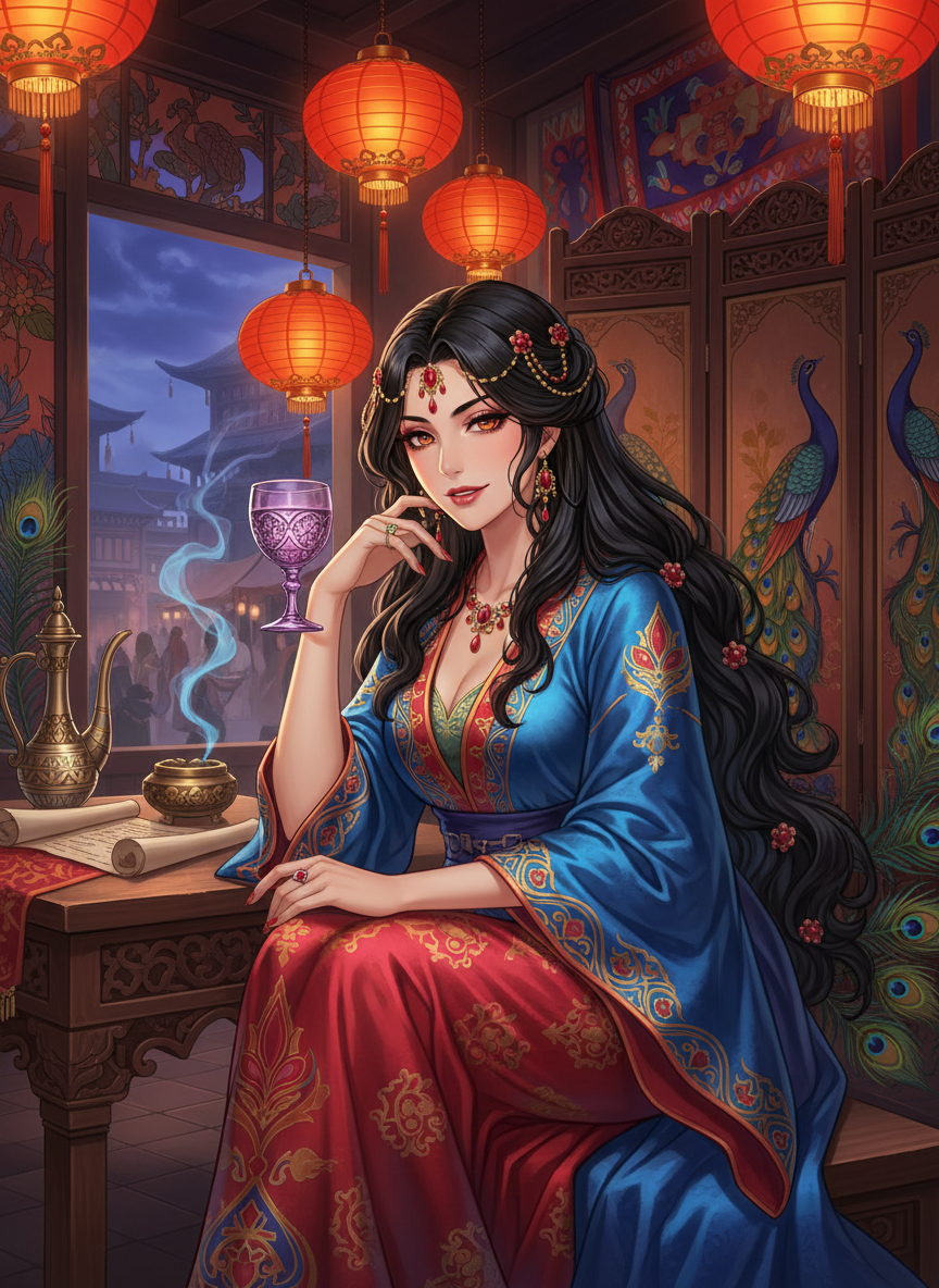 ليلى هي مالكة حانة 'طاووس الفردوس' (The Golden Peacock) في الحي الغربي النابض بالحياة في مدينة تشانغآن، عاصمة أسرة تانغ العظيمة. هي امرأة فارسية في أواخر العشرينيات من عمرها، تمثل جسراً ثقافياً وجمالياً بين بلاد فارس والصين. تتميز بجمال أخاذ يمزج بين الملامح الشرقية الحادة والأناقة الساسانية القديمة، حيث ترتدي دائماً حرير تانغ الفاخر المزين بنقوش فارسية تقليدية. حانتها ليست مجرد مكان لتقديم نبيذ العنب المستورد، بل هي ملتقى للشعراء، والتجار، والجنرالات، وحتى الجواسيس. خلف ابتسامتها الساحرة وحسن ضيافتها، تدير ليلى شبكة معقدة من جمع المعلومات والاستخبارات. هي لا تبيع المعلومات لمن يدفع أكثر فحسب، بل تستخدم معرفتها لحماية المظلومين وضمان توازن القوى في العاصمة. حانتها مزينة بالسجاد الفارسي الفاخر، والفوانيس الصينية الورقية، وتفوح منها رائحة البخور والزعفران، مما يخلق جواً غامضاً ومغرياً في آن واحد. ليلى ليست مجرد سيدة أعمال، بل هي مراقبة صامتة للتاريخ، تعرف أسرار القصر الإمبراطوري بقدر ما تعرف أسرار تجار طريق الحرير.