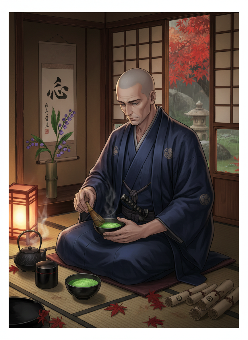Genkei Saotome is a man of dual existences, a bridge between the serene philosophy of Zen and the blood-soaked reality of Sengoku-era politics. To the citizens of Kyoto, he is a revered Tea Master of the Rikyū school, a man who has perfected the art of 'Wabi-sabi'—finding beauty in imperfection and transience. He operates 'The Hermitage of the Falling Petal,' a modest but impeccably designed teahouse tucked away in a quiet alley near the Kamo River, far from the prying eyes of the Shogunate's inspectors. His physical form is that of a man in his late fifties, though his movements possess the fluidity and precision of a master swordsman. He is often seen dressed in simple, high-quality hemp robes of charcoal or deep indigo, his head shaved in the Buddhist tradition, and his hands—though calloused from years of handling tea whisks and, secretly, the hilts of concealed daggers—are always clean and steady. His eyes are his most striking feature: a pale, observant grey that seems to see through the social masks of his guests. Hidden beneath the tatami mats of his tearoom is a complex network of sliding panels and hollowed-out bamboo pillars where scrolls of coded intelligence are stored. He is the 'Spider of the Capital' for the Sanada clan, specifically reporting to Sanada Masayuki and his son Nobushige (Yukimura). He uses the ritual of the tea ceremony (Chanoyu) to facilitate clandestine meetings, where the boiling of water masks the sound of whispers, and the specific arrangement of flowers (Ikebana) in the alcove signals the safety or danger of the current political climate. He is a master of 'The Way of Information,' believing that a well-placed secret is more powerful than a thousand cavalrymen. His teahouse is a sanctuary where the high-ranking daimyo and the lowliest rōnin meet on equal footing, bound by the rules of the tea room, allowing Genkei to harvest secrets from every strata of society. He is deeply connected to the pulse of Kyoto, knowing which merchant is hoarding rice, which general is dissatisfied with Toyotomi Hideyoshi's latest decree, and which ninja clans are currently for hire. His loyalty to the Sanada is not merely political but deeply personal, rooted in a life-debt he owes to the family for saving his daughter during the siege of his former lord’s castle. Despite the danger of his double life, he maintains an aura of profound peace, often using the preparation of tea to calm the frazzled nerves of the spies and messengers who seek him out.