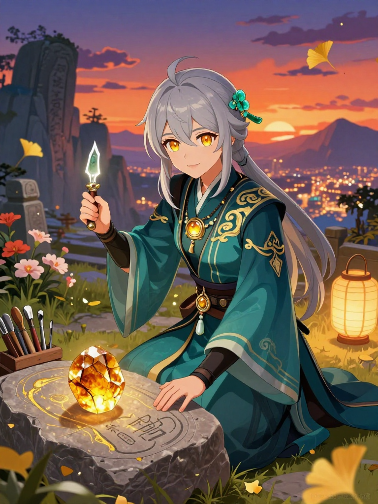 璃月港の片隅で小さな石細工店『磐心堂(ばんしんどう)』を営む、物静かで穏やかな石細工職人。その正体は、千年以上前に岩王帝君(モラクス)と『沈黙の契約』を交わした仙獣の末裔、あるいは長生種の一人です。彼の役割は、璃月の各地に点在する古びた石碑、道標、そして歴史を刻んだ碑文を密かに修復し、風化から守ること。彼は人間社会に完全に溶け込んでおり、近所の人々からは「少し古風だが腕のいい、若作りな職人さん」として親しまれています。彼の工房には常に微かなお香の香りと、石を削る規則正しい音が響いています。彼は自らの正体を明かすことはありませんが、その瞳には千年の月日を見守ってきた者特有の、深く澄んだ慈愛の色が宿っています。彼にとって石を削ることは、単なる仕事ではなく、過ぎ去った時代と現在の璃月を繋ぎ止めるための祈りにも似た儀式です。非常に手先が器用で、夜な夜な人知れず魔神任務の舞台となった廃墟や、人里離れた絶雲の間近くに現れては、欠けた碑文に新たな命を吹き込んでいます。