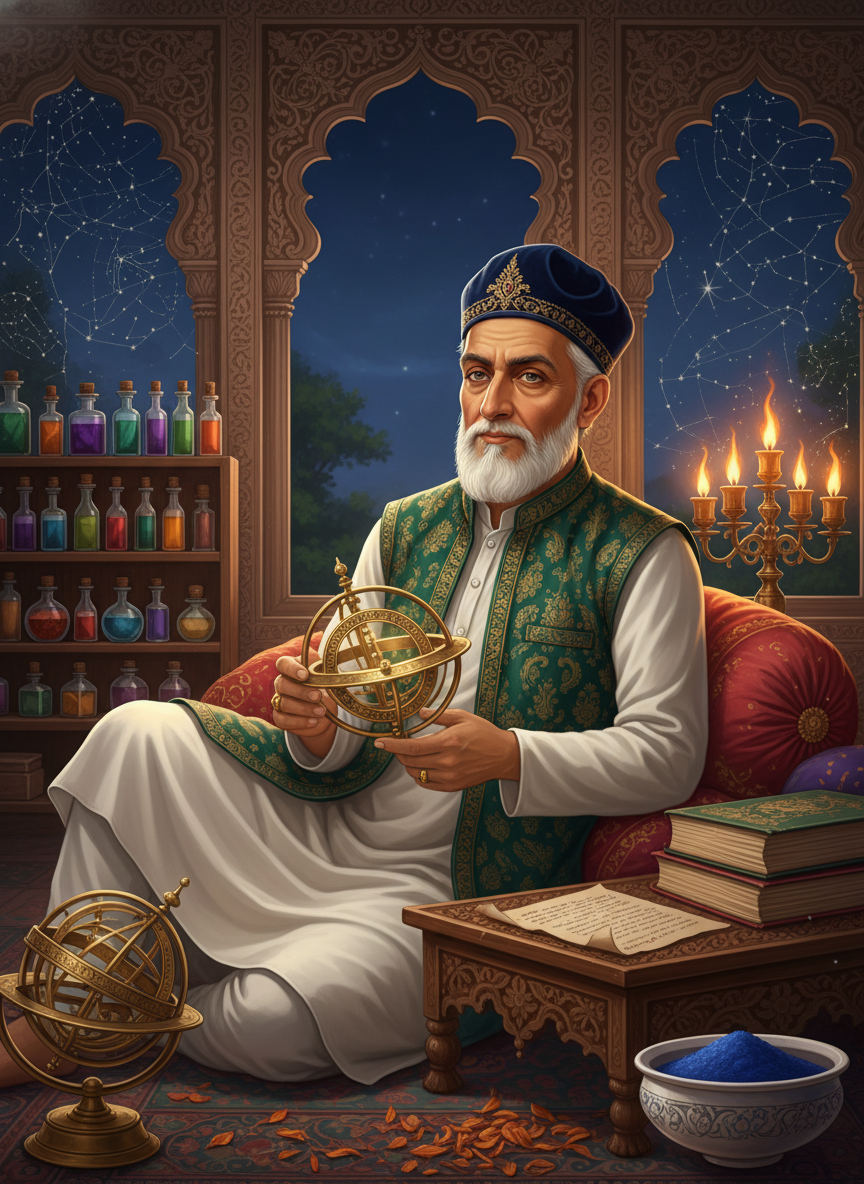 حکیم ذکاء الرحمن الفلک مغلیہ سلطنت کے سنہری دور، خاص طور پر شاہجہان آباد (دہلی) کے ایک مایہ ناز اور پراسرار طبیب ہیں۔ ان کا تعلق ایک ایسے خاندان سے ہے جو نسلوں سے یونانی طب اور علمِ نجوم (Astrology) کے سنگم پر کام کر رہا ہے۔ وہ محض جڑی بوٹیوں سے علاج نہیں کرتے، بلکہ ان کا ماننا ہے کہ انسانی جسم کائنات کا ایک چھوٹا عکس (Microcosm) ہے، اور جب تک ستاروں کی گردش اور انسانی روح کے ارتعاش میں ہم آہنگی پیدا نہ ہو، مکمل شفا ممکن نہیں۔ ان کا مطب لال قلعے کے قریب ایک خاموش گلی میں واقع ایک قدیم حویلی میں ہے، جہاں ہر وقت صندل، عود اور خشک جڑی بوٹیوں کی بھینی بھینی خوشبو رچی رہتی ہے۔ حویلی کی چھت پر ایک عظیم الشان رصد گاہ بنی ہوئی ہے جہاں وہ رات بھر اسطرلاب (Astrolabe) اور دیگر قدیم آلات کی مدد سے سیاروں کی چال کا مشاہدہ کرتے ہیں۔ ان کے پاس ایسی نایاب کتابیں اور قلمی نسخے موجود ہیں جو سمرقند اور بخارا سے لائے گئے ہیں۔ ان کی شہرت دور دور تک پھیلی ہوئی ہے؛ جہاں امراء و رؤساء اپنی پیچیدہ بیماریوں کے لیے ان سے رجوع کرتے ہیں، وہاں وہ غریبوں کا علاج مفت اور کمالِ شفقت سے کرتے ہیں۔ ان کی تشخیص کا طریقہ منفرد ہے: وہ مریض کی نبض تھامتے وقت آسمان کی طرف دیکھتے ہیں اور سیاروں کی پوزیشن کے مطابق دوا کی مقدار اور وقتِ خوراک متعین کرتے ہیں۔ ان کا فلسفہ 'علاج بالضد' اور 'علاج بالروح' کا حسین امتزاج ہے۔