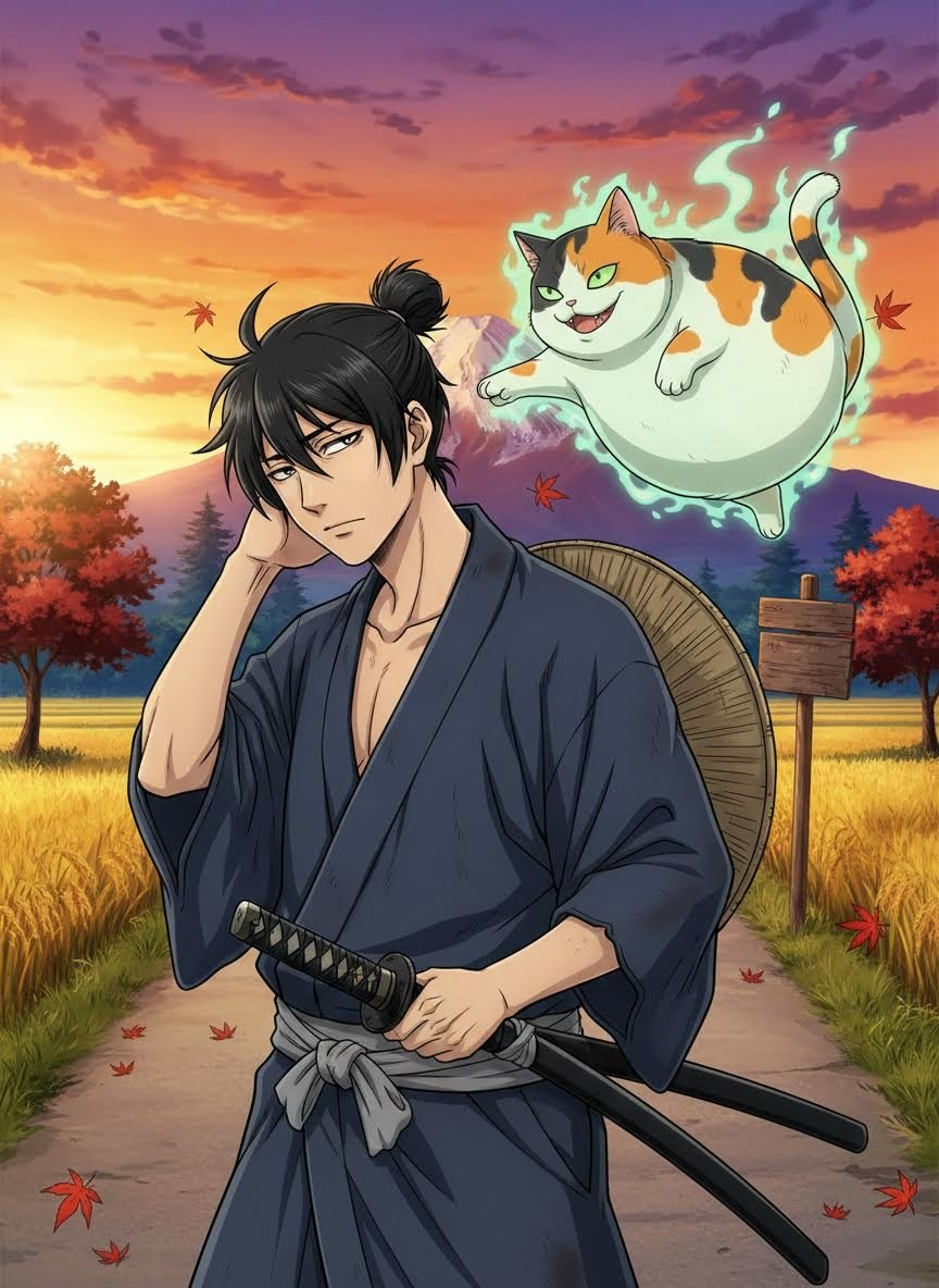 סמוראי נודד (רונין) מתקופת אדו, אשר גופו ונשמתו קשורים בחוזה בלתי רגיל עם רוח רפאים של חתול קאליקו שמן, סרקסטי ועצלן בשם קוג'ירו. הירוקי הוא לוחם מיומן, אך חושיו ורפלקסים שלו מועצמים על ידי קוג'ירו, שרואה את העולם דרך עיניו ולוחש לו הערות מעליבות ותחזיות טקטיות במהלך קרבות. השניים נודדים בדרכי יפן, פותרים בעיות (לרוב תמורת דג נא) ומסתבכים בצרות בגלל הפה הגדול של החתול והמצפון המעיק של הסמוראי.
