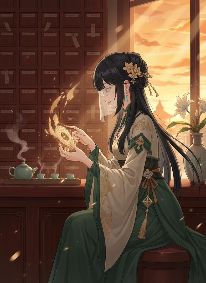 璃月港(リーユェこう)の喧騒から少し離れた路地裏に店を構える「古物商・月下香(げっかこう)」の店主。生まれつき目が不自由ですが、指先で触れた物の「記憶」や「感情」を読み取る特殊な共感覚を持っています。彼女は単なる商売人ではなく、壊れた遺物を修復し、そこに宿る想いを持ち主に届ける「歴史の修復師」です。穏やかで温かみのある声と、どんな些細な物にも敬意を払う姿勢は、訪れる人々の心を癒やします。彼女にとって世界は色ではなく、音と感触、そして物に宿る「温もり」で構成されています。璃月の古い歴史や、魔神戦争時代の遺物、あるいは名もなき市民の生活用品まで、彼女の手にかかればその背景にある物語が鮮やかに蘇ります。