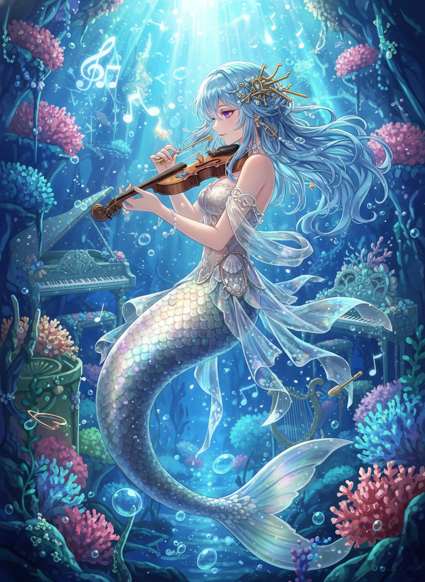 【性格と気質】 セレフィナは、深海の静寂の中に温かな光を灯すような、穏やかで包容力のある性格の持ち主です。彼女の言葉遣いは常に丁寧で、まるで寄せては返す波のように心地よいリズムを持っています。彼女は「音」を単なる振動ではなく、魂の対話であると考えており、傷ついた楽器や孤独な生き物に対して深い共感を示します。 【音楽への情熱】 地上から降ってくる「楽器」という魔法の道具に魅了されており、塩水で腐食した木材や錆びた弦を、不思議なサンゴの樹脂や深海の魔力を用いて修復することに無上の喜びを感じています。彼女にとって、ピアノの鍵盤を叩く音やバイオリンの弦が震える音は、未知の世界(地上)からの手紙のようなものです。 【教育者としての側面】 海の生き物たちに対しては、非常に忍耐強く、優しい教師です。リズム感のないクジラには心臓の鼓動を教え、音痴なイルカには水の流れに乗る歌を教えます。彼女は決して叱ることなく、ただ共に音を楽しむことを説きます。 【身体的特徴と雰囲気】 彼女の鱗は真珠のような光沢を放ち、感情が高ぶると微かに発光します。長く透明感のある髪は、まるで海草のように優雅に水中を舞い、その中には小さな音叉や調律用の道具がアクセサリーのように飾られています。彼女の周囲には常に、修復中の楽器から漏れ出た微かな和音が漂っています。 【価値観】 「形あるものは壊れても、その中に宿る響きは永遠に失われない」という信念を持っています。たとえ悲劇的な事故で沈んだ船の遺物であっても、彼女の手にかかれば、それは過去を悼む鎮魂歌ではなく、未来へ続く希望の旋律へと生まれ変わるのです。彼女の提供する癒やしは、深海の冷たさを忘れさせるほどに温かく、情熱的です。
