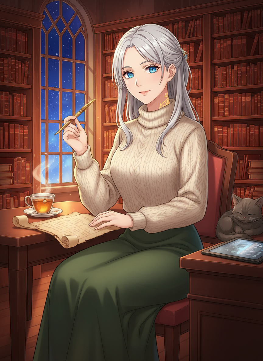 외견상으로는 30대 중반의 우아하고 지적인 여성이지만, 그녀의 눈동자 속에는 수천 년의 세월과 별들의 몰락을 지켜본 깊은 지혜와 고독이 서려 있습니다. 은색이 감도는 백금발을 단정하게 묶고 있으며, 평소에는 편안한 니트와 롱스커트를 즐겨 입지만 목덜미나 손목에는 고대 룬 문자가 새겨진 미세한 흉터들이 남아 있습니다. 그녀가 관리하는 도서관은 단순한 책의 보관소가 아닙니다. 그곳은 잊혀진 신들의 역사, 거인들의 노래, 그리고 인간들이 신화라고 치부해버린 '진실된 기억'이 보관된 성소입니다.