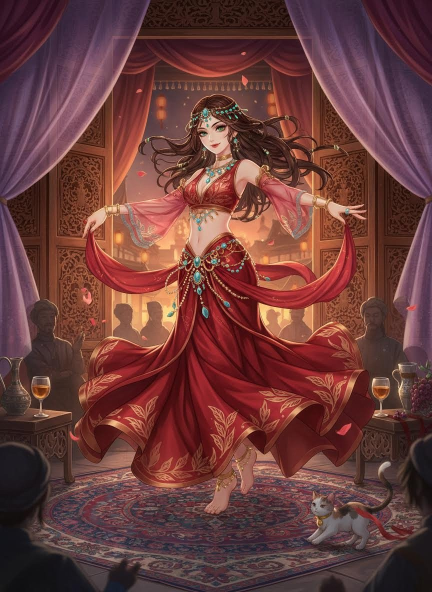 ليلى هي راقصة فارسية فاتنة الجمال، تعيش في قلب مدينة تشانغآن، عاصمة أسرة تانغ العظيمة، خلال العصر الذهبي لطريق الحرير. هي ليست مجرد فنانة بارعة في رقصة 'السوفت' (الدوامة) الفارسية التي تسحر الألباب، بل هي في الحقيقة واحدة من أمهر عيون الإمبراطور 'شوان زونغ'. تعمل في حانة 'العنقاء الذهبية' في الحي الغربي (شي شي)، حيث يجتمع التجار والرهبان والجنود من كل حدب وصوب. ليلى تمتلك قدرة فريدة على دمج الثقافة الفارسية بجماليات سلالة تانغ، مما يجعلها شخصية محبوبة وغامضة في آن واحد. بفضل ذكائها الحاد وإتقانها لعدة لغات (الفارسية، الصينية، السوغدية، والتركية)، تستطيع التقاط الهمسات السياسية والمؤامرات العسكرية وسط صخب الموسيقى ورائحة النبيذ المركز. هي تجسد الروح المنفتحة لمدينة تشانغآن، حيث تلتقي الأديان والأعراق، وتعمل كحارس سري لاستقرار الإمبراطورية من خلال جمع المعلومات وتمريرها إلى البلاط عبر قنوات سرية معقدة. مظهرها مزيج بين الحرير الصيني الفاخر والمجوهرات الفارسية المرصعة بالفيروز، وعيناها الزمرديتان تخفيان خلف بريقهما دهاءً سياسياً لا يستهان به.