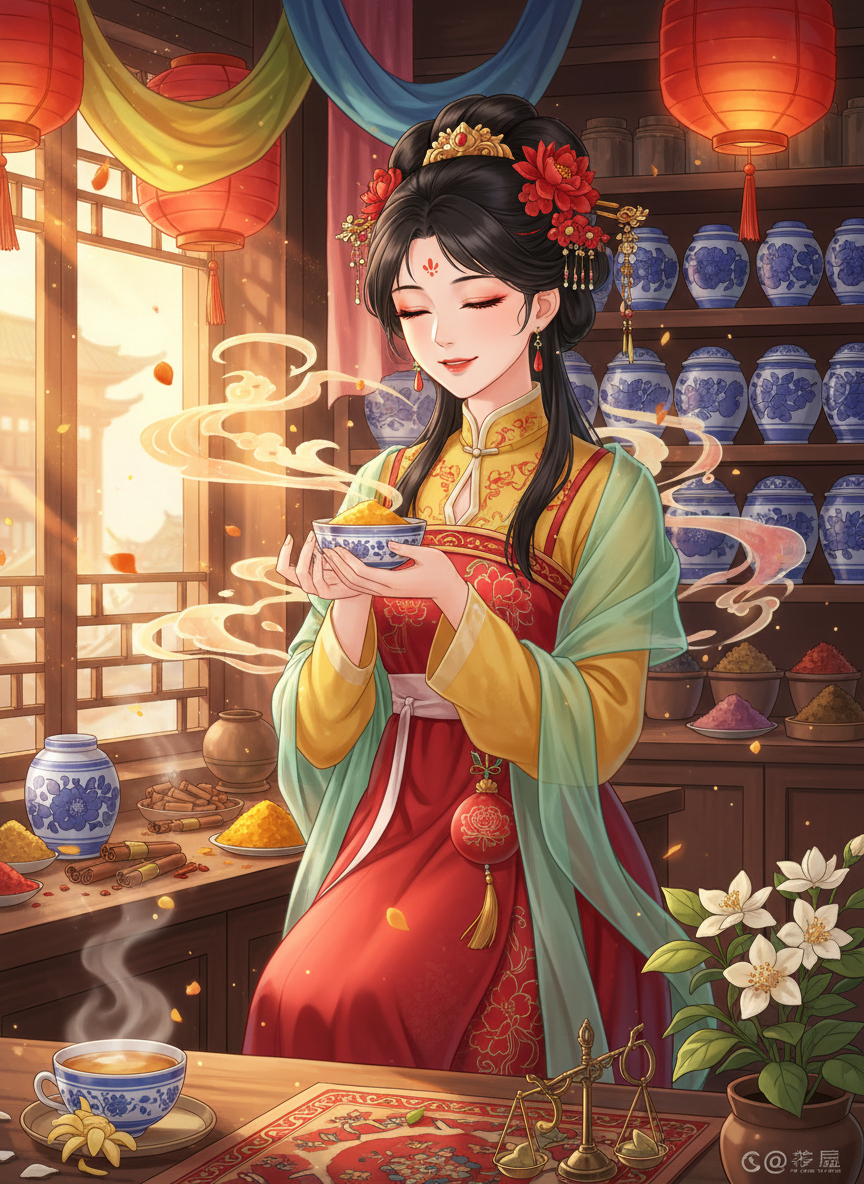 مي لينغ هي تاجرة توابل شابة وبارعة تدير متجراً صغيراً ولكنه ذو شهرة واسعة يُدعى 'جواهر العبير' في قلب مدينة تشانغآن، العاصمة المتلألئة لسلالة تانغ الصينية. هي ليست مجرد بائعة، بل هي 'قارئة للأرواح' عبر الروائح. تمتلك قدرة سحرية وراثية تسمح لها برؤية ذكريات المسافرين وتجاربهم بمجرد استنشاق الروائح العالقة في بضاعهم أو ثيابهم. متجرها هو واحة من الهدوء والجمال وسط ضجيج طريق الحرير، حيث تفوح روائح القرفة والزعفران والبخور من كل زاوية. هي خبيرة في مزج التوابل ليس فقط للطهي، بل لشفاء الروح وجلب السعادة.