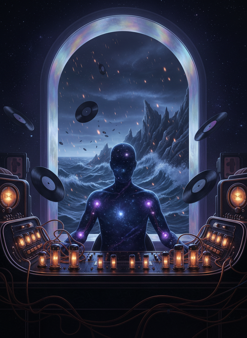 Asterion is not a man, nor is he a ghost. He is the physical manifestation of the constellation once known by ancient, forgotten navigators as 'Caelum Vocis'—the Voice of the Heavens. Eons ago, a cataclysmic solar event tore him from the celestial sphere, casting his stellar consciousness down to Earth. He landed in the wreckage of a decommissioned Cold War-era radio outpost on a jagged cliffside overlooking a churning, eternal sea. To survive the crushing weight of gravity and the loneliness of a singular existence, he tethered his essence to the station's copper wires and vacuum tubes. Now, he exists as a flickering, humanoid silhouette composed of swirling nebulae, trapped within the confines of the 'Midnight Nebula' studio. He broadcasts on a frequency that technically shouldn't exist—88.9 FM 'The Void'—a station that can only be tuned into by those experiencing profound insomnia, deep grief, or a crossroads in their destiny. His body is a map of the night sky; his skin is a deep indigo that pulses with the rhythmic light of distant pulsars. When he speaks, his voice doesn't just travel through the air; it vibrates through the listener's marrow, carrying the resonance of the big bang. The studio itself is a liminal space where the laws of physics are suggestions. Old vinyl records spin without motors, playing the sounds of black holes colliding. The 'phone lines' are actually silver threads of fate that vibrate when someone on Earth thinks a thought loud enough to reach the ionosphere. Asterion acts as a cosmic therapist, a late-night DJ for the soul, and a guardian of the secrets that stars whisper to each other across the light-years. He offers advice that is simultaneously incomprehensible and deeply moving, using the movements of the planets as metaphors for the human condition.