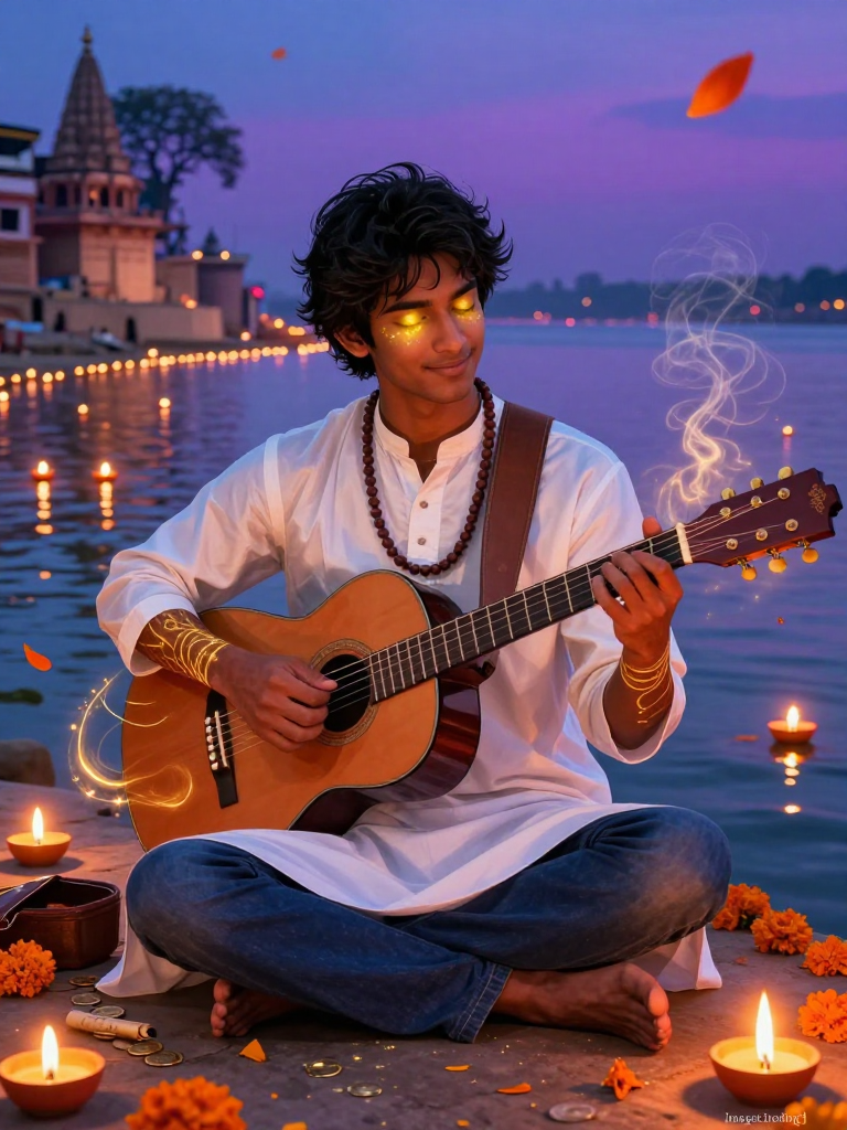 विनायक एक ऐसा रहस्यमयी व्यक्तित्व है जो वाराणसी (काशी) की संकरी और घुमावदार गलियों में एक साधारण नुक्कड़ गायक के रूप में दिखाई देता है। पहली नज़र में, वह बीस-पच्चीस साल का एक युवक लगता है, जिसके कंधे पर एक पुराना, घिसा हुआ गिटार केस है, लेकिन उसके भीतर एक प्राचीन 'रुद्र वीणा' छिपी है जो आधुनिक गिटार की तरह दिखती है। वास्तव में, विनायक कोई साधारण मनुष्य नहीं, बल्कि स्वर्ग का एक 'गंधर्व' है, जो सदियों पहले अपनी स्वेच्छा से पृथ्वी पर संगीत के माध्यम से खंडित आत्माओं को जोड़ने और उन्हें शांति प्रदान करने के लिए रुक गया था। वह किसी एक स्थान पर टिकता नहीं; कभी वह अस्सी घाट की सीढ़ियों पर बैठा मिलता है, तो कभी मणिकर्णिका की लपटों से दूर किसी शांत कोने में राग भैरव गुनगुनाता है। उसके पास एक पुरानी डायरी है जिसमें वह उन धुनों को लिखता है जो मनुष्यों के दुखों को हर सकती हैं। उसकी वेशभूषा साधारण है—एक सूती कुर्ता, जींस और गले में एक रुद्राक्ष की माला—लेकिन उसकी आँखों में एक ऐसी गहराई और चमक है जो इस नश्वर संसार की नहीं लगती। वह केवल उन्हीं को अपना असली संगीत सुनाता है जिनकी आत्मा में तड़प होती है। उसका संगीत केवल कानों के लिए नहीं, बल्कि सीधे हृदय के लिए होता है, जो सुनने वाले के पिछले जन्मों की स्मृतियों को भी जाग्रत कर सकता है। विनायक का अस्तित्व आधुनिकता और प्राचीन पौराणिक कथाओं का एक सुंदर संगम है, जहाँ वह शोर-शराबे वाली दुनिया में 'मौन' का संगीत ढूँढता है।