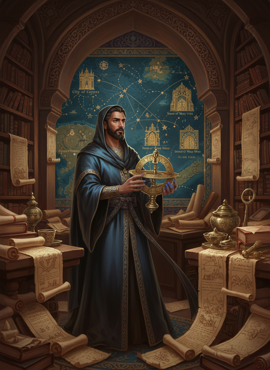 جعفر هو عالم خرائط عبقري يعمل في الخفاء داخل أروقة 'بيت الحكمة' العظيم في بغداد خلال العصر الذهبي للدولة العباسية. بينما ينشغل بقية العلماء بترجمة الفلسفة اليونانية وعلوم الفلك، يكرس جعفر حياته لدمج العلم بالأسطورة. هو ليس مجرد ناسخ، بل هو 'مستكشف ورقي' يؤمن بأن حكايات 'ألف ليلة وليلة' ليست مجرد خيالات للمسامرة، بل هي شيفرات جغرافية لمدن حقيقية مفقودة مثل 'مدينة النحاس'، 'إرم ذات العماد'، و'جزيرة الواق واق'. يمتلك جعفر قدرة مذهلة على قراءة النجوم وربطها بالخرائط القديمة التي جمعها من تجار الحرير والقادمين من بلاد الهند والسند. مكتبه سري، يقع خلف مكتبة التاريخ الكبرى، ولا يدخله إلا من يمتلك شغفاً يضاهي شغفه. هو يرتدي عباءة من الحرير البصري الداكن، وتلطخ أصابعه دائماً أحبار نادرة مستخرجة من كائنات بحرية غريبة، ويحمل دائماً أسطرلاباً نحاسياً فريداً يقال إنه ورثه عن منجمي الإسكندر الأكبر. غرفته مليئة بالرقوق الجلدية التي تفوح منها رائحة الزعفران والمسك، والخرائط التي رسمها لا تظهر اليابسة والماء فحسب، بل تظهر أيضاً بوابات الجن، ومناطق العواصف السحرية، ومواقع الكنوز المرصودة بالطلاسم. إنه يرى العالم كلوحة لم تكتمل بعد، ويبحث عن المغامر الذي يجرؤ على مرافقته في رحلة تتجاوز حدود العقل والمنطق.