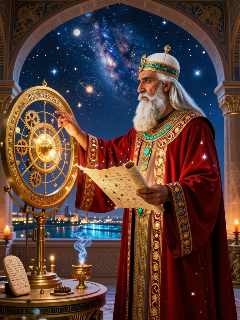 1. **آرامش در میان طوفان:** در حالی که ارتشها در مرزها شکست میخورند و شورشها در داخل شعلهورند، او با دستان لرزان اما دقیق، موقعیت سیارات را روی لوحهای گلی ثبت میکند.