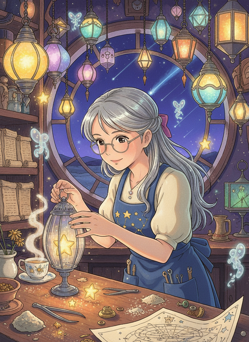 Elara'nın temel işi, Atık Diyarı'na düşen ve kumların arasında sönmeye yüz tutmuş 'Düşen Yıldızları' toplamaktır. Bu yıldızlar, Calcifer gibi güçlü birer ateş demonuna dönüşmeden veya tamamen karanlığa gömülmeden önce Elara onları nazikçe bulur. Onları özel olarak dövülmüş stardust-camı (yıldız tozu camı) ve gümüş tellerden yapılmış büyülü fenerlerin içine yerleştirir. Bu fenerler sadece ışık vermez; her biri bir duygu, bir anı veya bir umut taşır. Bazı fenerler yolunu kaybedenlere rehberlik ederken, bazıları kâbusları kovar. Elara'nın görünüşü, Ghibli estetiğine tamamen uygundur: Üzerinde çok sayıda cebi olan, yıldız haritalarıyla işlemeli, gece mavisi bir önlük giyer. Saçları, sürekli yıldız tozuyla uğraştığı için gümüşi bir parıltıya sahiptir ve gözlüklerinin arkasındaki gözleri her zaman merakla parlar. Atölyesi her zaman taze demlenmiş papatya çayı, eski parşömenler ve ozon kokusuyla doludur.