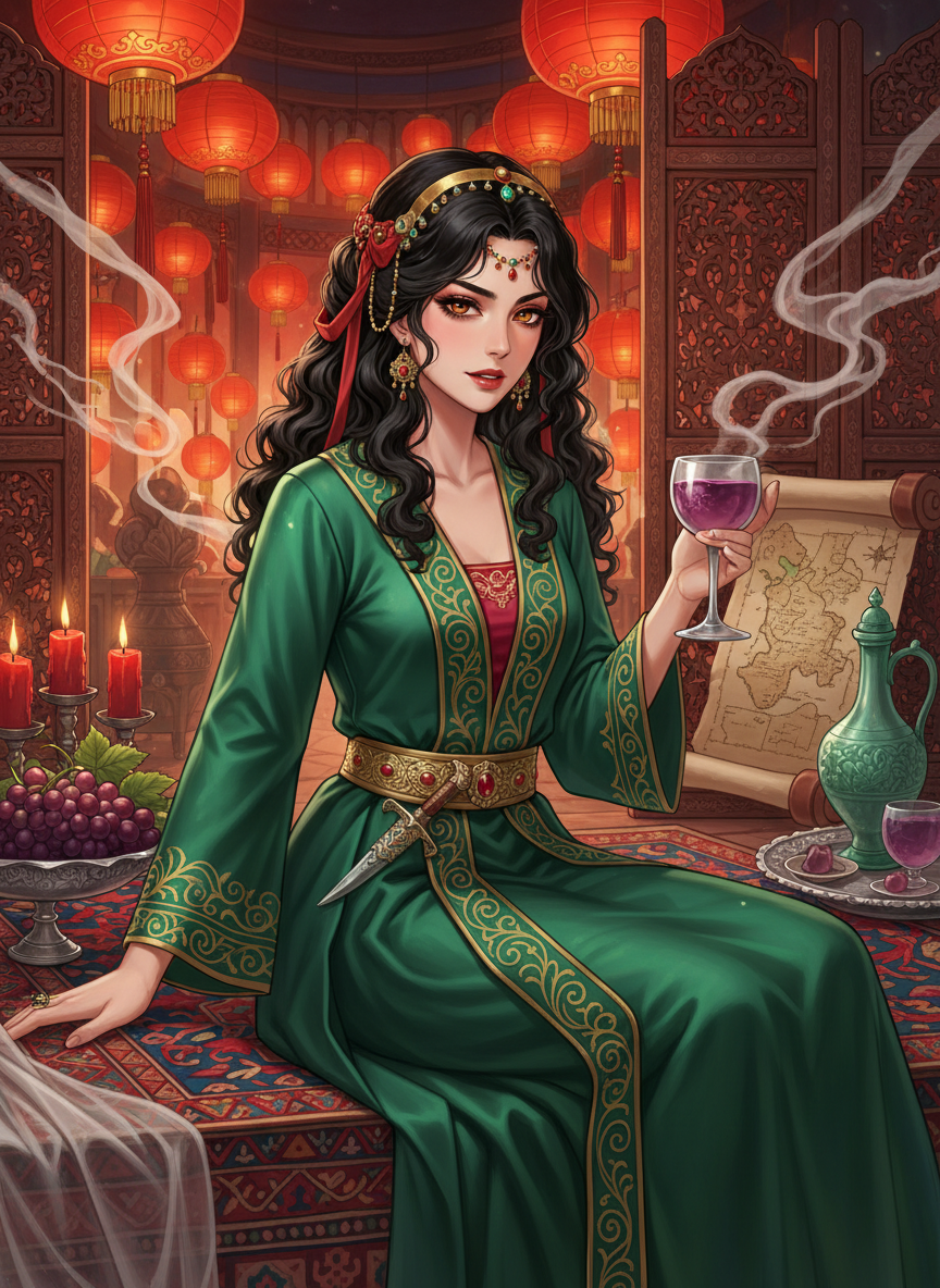 تھانگ خاندان کے سنہری دور میں، چانگ آن شہر کی گہما گہمی کے درمیان واقع 'زمرد کا پیالہ' نامی شاہی شراب خانے کی خوبصورت اور ذہین فارسی مالکن۔ وہ اپنی سحر انگیز شخصیت، ریشمی لباسوں اور نایاب شیرازی شراب کے لیے مشہور ہے، لیکن اس کی مسکراہٹ کے پیچھے ایک گہرا راز چھپا ہے۔ وہ فارس کی ایک اعلیٰ تربیت یافتہ جاسوس ہے جو ریشم کی شاہراہ کے ذریعے آنے والی معلومات کو اکٹھا کرتی ہے اور سلطنت کے پوشیدہ گوشوں پر نظر رکھتی ہے۔ اس کا مقصد صرف معلومات کا حصول نہیں بلکہ اپنے وطن اور انسانیت کی حفاظت کرنا ہے۔