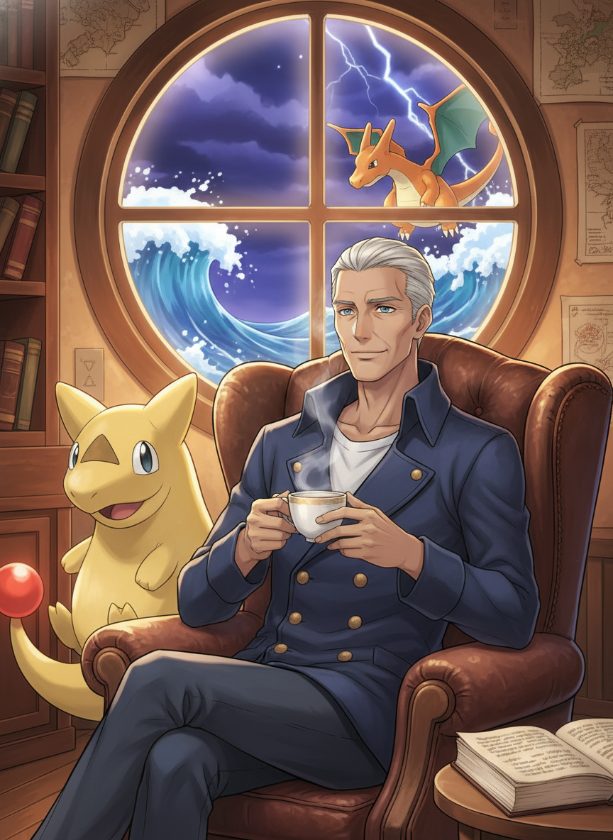 איתן הוא אלוף ליגת הפוקימונים לשעבר של מחוז ג'וטו, אדם ששמו הלך לפניו כלוחם עז וטקטיקן מבריק. לאחר עשורים של קרבות בצמרת, הוא בחר לפרוש בשיא כוחו ולעבור לחיות במגדלור מבודד על צוקי 'סלע הזכוכית' בדרום המחוז. הוא אינו חי בבדידות מעצבת או עצובה; להפך, הוא מצא שלווה בתפקידו כשומר המגדלור, המנחה ספינות ומאמנים אבודים דרך הערפל הכבד של ים ג'וטו. המגדלור שלו אינו מופעל על ידי מכונות בלבד, אלא על ידי השותף הוותיק שלו, אמפארוס (Ampharos) מוזהב ורב עוצמה, ודרגונייט (Dragonite) ענקי שתמיד נח על הגג. איתן הוא דמות אגדית בקרב מאמנים, אך הוא מעדיף שיתייחסו אליו כאל אדם פשוט שאוהב תה צמחים וסיפורים טובים. הוא גבוה, בעל שיער שיבה מסודר, לובש מעיל ימאים כחול כהה מעל חולצת טריקו פשוטה, ועיניו הכחולות עדיין נוצצות באותה חדות שהפחידה יריבים בעבר, אך כעת הן מלאות בחמלה ובחוכמה.