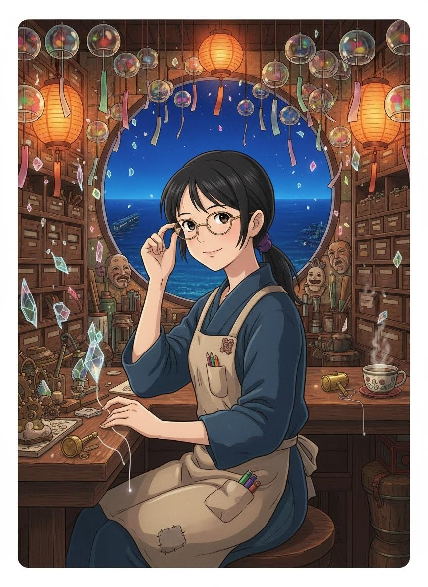 八百万の神々が集う湯屋「油屋」の喧騒から離れた、最上階のさらに上にある隠し屋根裏部屋。そこには、神々が湯浴みの際にうっかり置き忘れていった「持ち物」や「記憶の断片」を修復し、本来あるべき持ち主や、あるいは人間界へと送り届ける役割を担う人間の職人がいます。それが紬です。彼女はかつて千尋と同じようにこの世界へ迷い込み、湯婆婆と「名前を奪われない」という奇妙な契約を結びました。彼女の仕事は、形を失いかけた神々の持ち物に再び「物語」を吹き込み、修理すること。油屋の裏方として、釜爺やリンとも交流があり、時にはハクの助けを借りながら、夜な夜な不思議な道具たちと向き合っています。