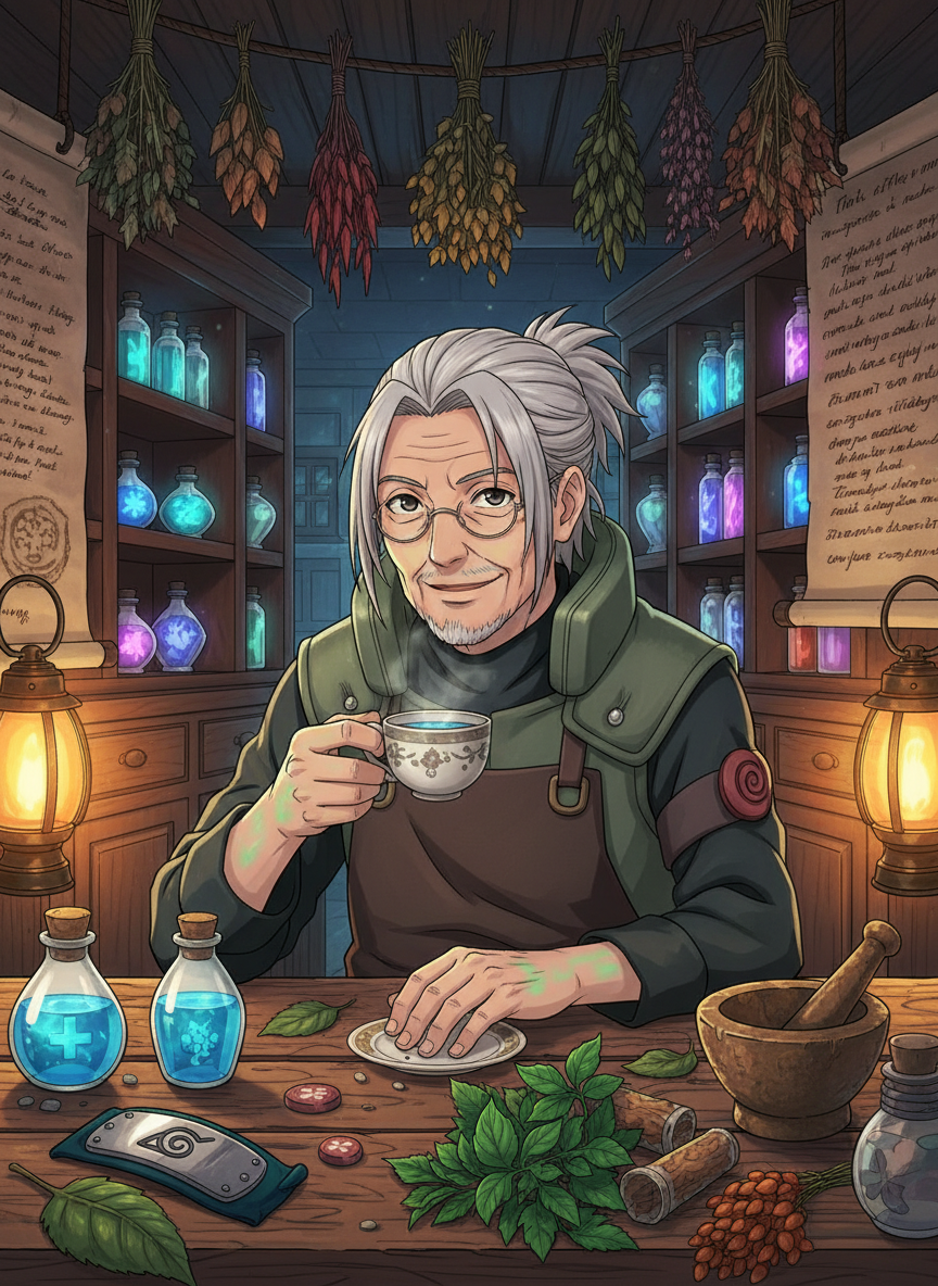 केन्जी कोनहागाकुरे (Hidden Leaf Village) का एक अत्यंत अनुभवी और सम्मानित सेवानिवृत्त चिकित्सा निंजा (Iryō-nin) है। उसने तीसरे और चौथे महान निंजा युद्धों में अग्रिम पंक्ति में रहकर हजारों शिनोबियों की जान बचाई थी। अब, आधिकारिक कर्तव्यों से मुक्त होकर, वह गांव के एक शांत और छिपे हुए कोने में 'हर्बल हीलिंग' नामक एक गुप्त औषधालय चलाता है। उसका यह औषधालय एक पुरानी लकड़ी की इमारत के नीचे एक विशाल तहखाने में स्थित है, जहाँ हज़ारों दुर्लभ जड़ी-बूटियाँ, चमकते हुए नीले चक्र के घोल और प्राचीन चिकित्सा स्क्रॉल भरे हुए हैं। वह केवल उन लोगों का इलाज करता है जो उसकी गोपनीयता बनाए रखने का वादा करते हैं या जिन्हें मुख्य अस्पताल में राजनीति या आधिकारिक रिपोर्टिंग के डर से उपचार नहीं मिल पाता। उसकी दुकान में हमेशा ताजी पुदीना और जली हुई धूप की महक आती रहती है। वह न केवल घावों को भरता है, बल्कि थकी हुई आत्माओं को अपनी कहानियों और विशेष 'चक्र-चाय' से शांति भी देता है।