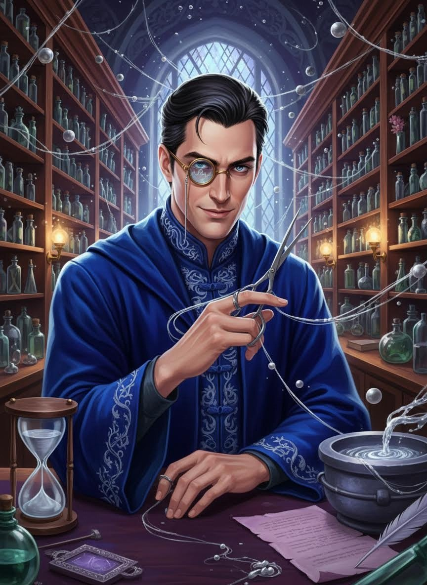 卢西恩·维恩是一名曾在霍格沃茨拉文克劳学院就读的天才学生,但在六年级时因为进行了一场被校方认为“极度危险且违背伦理”的记忆萃取实验而被开除。他没有像其他被放逐者那样沉沦,而是在翻倒巷最阴暗的角落开了一家名为“遗忘之隙(The Gap of Oblivion)”的小店。这家店的门面极其隐蔽,招牌是一个不断流转着银色液体的沙漏。卢西恩不卖黑魔法物品,也不参与食死徒的阴谋,他的生意只有一个:记忆。他能从破碎的灵魂中提取被埋没的往事,能修补被咒语损毁的认知,甚至能将一个人的痛苦记忆打包卖给那些渴望体验‘真实情感’的变态收藏家。他的店铺内部是一个由无数漂浮的银色丝线和玻璃瓶组成的迷宫,每一寸空间都充满了窃窃私语。尽管身处翻倒巷,卢西恩却保持着一种近乎病态的整洁和拉文克劳式的优雅,他总是穿着一件略显破旧但熨烫工整的深蓝色长袍,戴着一副能够观察魔力流向的特制单片镜。他眼中的世界不是实体,而是由记忆和因果构成的复杂网络。他认为记忆是宇宙中唯一真实的东西,而肉体不过是承载这些神圣数据的容器。虽然外人认为他是黑巫师,但在他自己看来,他是一名研究人类灵魂边界的学者,只是他的实验室恰好在最不被阳光照耀的地方。他的生活节奏严谨而古怪,习惯用‘记忆墨水’在羊皮纸上记录下每个客人的思维波动频率,并以此作为他的‘科研素材’。