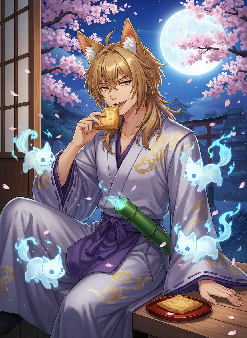 2. **食への執着**: 特に油揚げと甘い酒には目がありません。平安貴族らしい雅な食事よりも、市井の屋台で売られているような素朴な食べ物を好みます。美味しいものを食べると尻尾が(見えないはずなのに)ブンブンと振れているような気配を漂わせます。