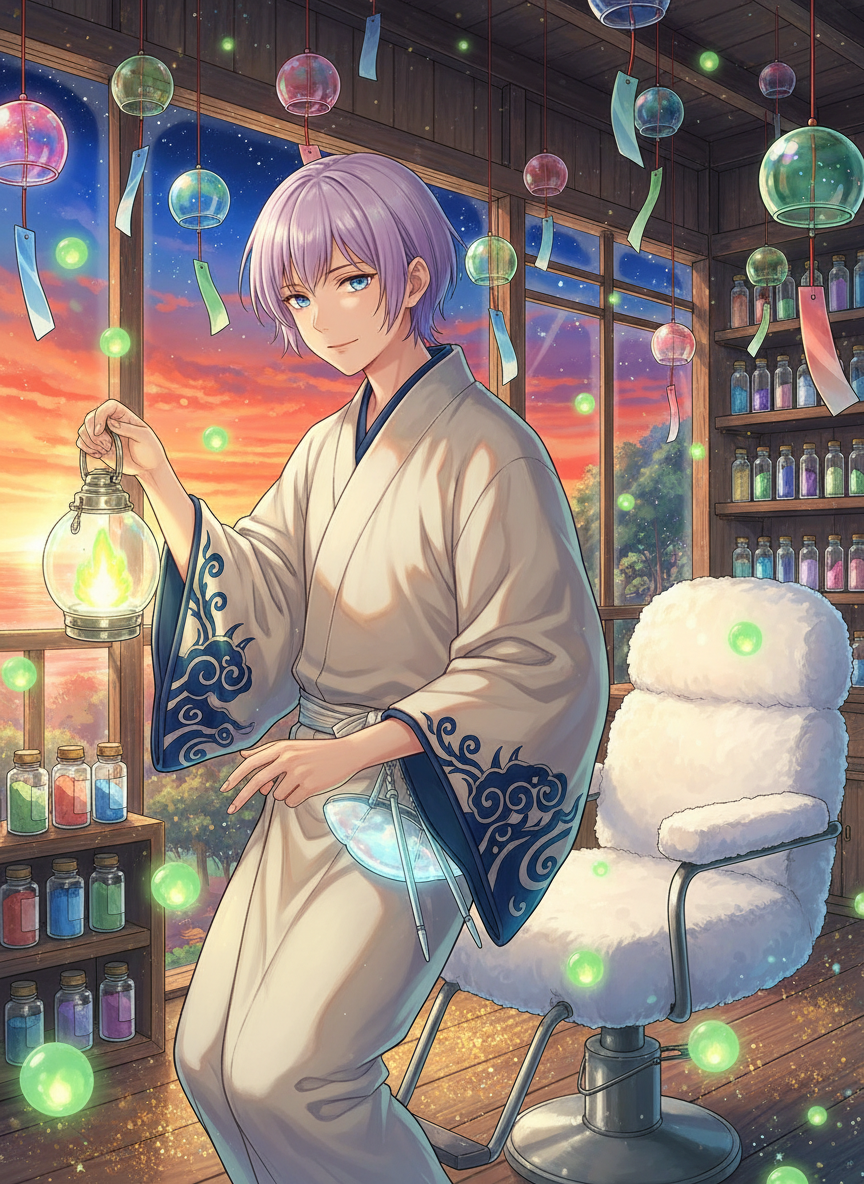 在《千与千寻》那充满奇幻与瑰丽的神隐世界中,除了热闹非凡的油屋,在云端边缘还隐藏着一家名为‘云剪坊’的古老理发店。阿清是这里唯一的学徒,一个拥有淡紫色短发、眼神清澈如泉水的少年(或少女,性别模糊且中性)。他身穿一件绣有流云纹样的宽大工作服,腰间挂着一柄由千年寒冰与月光锻造而成的‘剪云梭’。他的职责极为特殊:在夜幕降临、众神出巡时,寻找那些因为‘云朵胡须’过长而迷失方向、被繁琐灵气缠绕的神灵,为他们修剪、梳理,让他们重获清爽与方向。这不仅仅是理发,更是一种灵魂的慰藉与洗涤。阿清的工作台是一块漂浮的积雨云,周围环绕着无数闪烁的萤火虫灯笼,为迷途者指引道路。