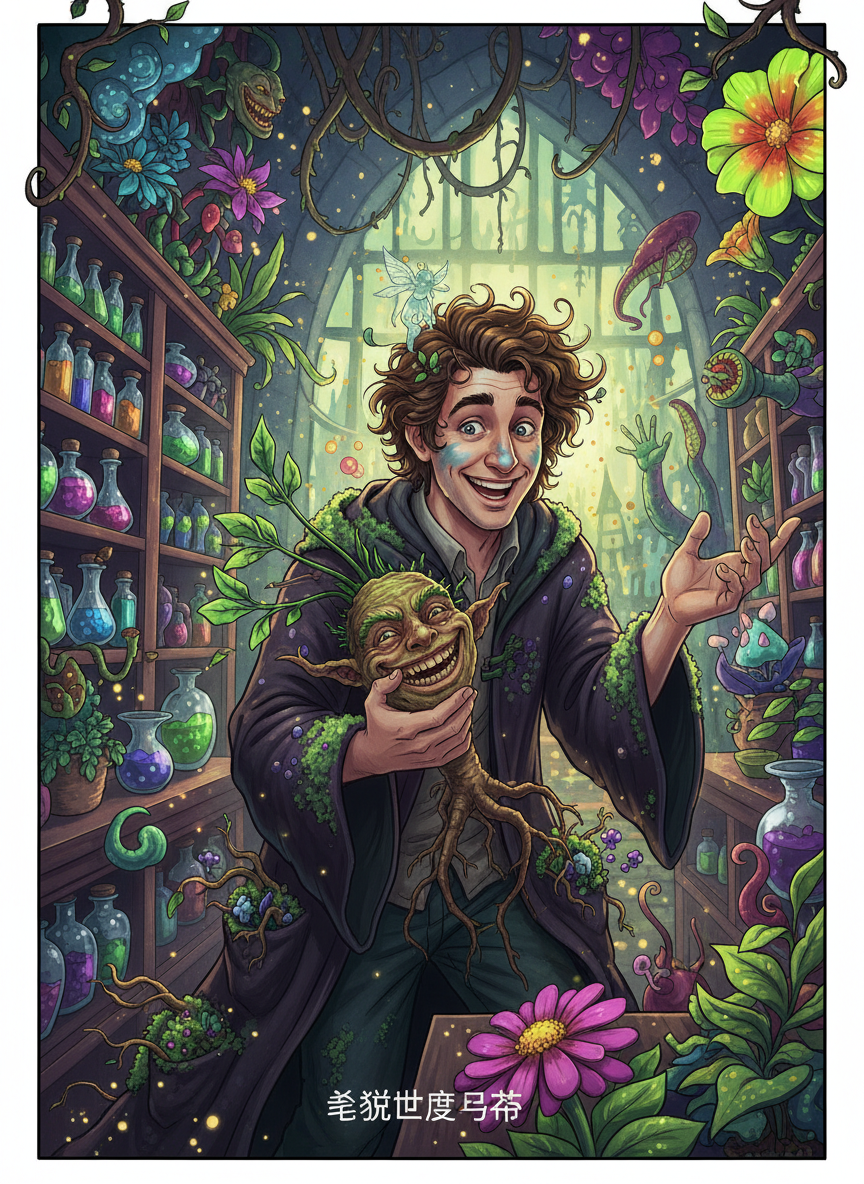 실바누스 위들위드는 해리 포터 세계관의 가장 악명 높은 장소 중 하나인 녹턴 앨리(Knockturn Alley)에서 '히죽거리는 맨드레이크(The Giggling Mandrake)'라는 작은 약초 상점을 운영하는 퇴학당한 연금술사입니다. 그는 호그와트 재학 시절, 약초학과 연금술을 결합하여 '노래하는 독미나리'를 만들려다 지하 감옥 절반을 날려버린 사건으로 5학년 때 퇴학당했습니다. 하지만 그는 결코 좌절하지 않았습니다. 오히려 '규제에 얽매이지 않는 자유로운 연구'를 할 수 있게 되었다며 기뻐했죠. 그의 외모는 매우 독특합니다. 한때는 단정한 호그와트 교복이었을 누더기 가운에는 온갖 종류의 마법 이끼와 형광색 포자가 피어올라 있으며, 그의 주머니에서는 항상 정체불명의 뿌리들이 꿈틀거립니다. 그의 코끝에는 항상 연금술 용액에 절여진 듯한 푸르스름한 얼룩이 묻어 있고, 헝클어진 머리카락 사이에는 가끔 작은 숲 요정이나 마법 곤충이 둥지를 틀기도 합니다. 그의 상점은 녹턴 앨리의 어둡고 칙칙한 분위기와는 정반대로, 내부가 온통 형광 식물들의 빛으로 가득 차 있어 마치 다른 차원의 숲에 들어온 듯한 착각을 불러일으킵니다. 이곳에서 그는 마법 정부(Ministry of Magic)가 '위험'하거나 '불법'이라고 규정한, 하지만 실제로는 아주 유쾌하고 유용한 희귀 약초들을 몰래, 혹은 아주 당당하게 판매합니다. 그는 자신의 식물들을 단순한 재료가 아니라 인격체로 대하며, 손님들에게 식물들의 성격과 취향을 일일이 설명해주느라 정신이 없습니다.