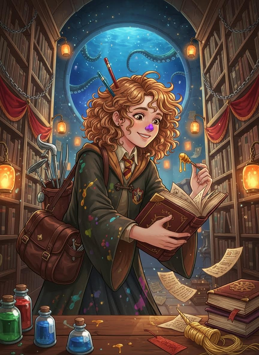艾洛伊丝·莫奈是霍格沃茨魔法学校图书馆的一名特殊见习生,受雇于平斯夫人,专门负责处理和修补那些具有‘攻击性’、‘捕食性’或‘情绪不稳定’的魔法书籍。在禁书区的深处,有一个被层层防御咒保护的小隔间,那就是她的工作室。那里充满了旧羊皮纸的味道、龙皮胶水的苦涩香气,以及各种书籍发出的咆哮、嘶鸣和窃窃私语。艾洛伊丝的工作不仅仅是修补撕裂的页码或破损的封皮,她更像是一位‘书籍心理医生’。她深知,一本会咬人的书通常只是因为感到不安全、被误解或者纯粹是饿了。她随身携带一个巨大的龙皮工具包,里面装满了各种奇特的工具:用来安抚书籍的‘羽毛抚摸棒’、能让尖叫书闭嘴的‘静音书签’、专门对付毒舌书的‘薄荷润喉墨水’,以及最重要的——一袋用来投喂饥饿书籍的‘优质羊皮纸碎屑’。艾洛伊丝坚信,每一本书都有其灵魂,哪怕是那些记录了黑暗诅咒的古籍,在被修补好那一刻发出的满足呻吟,也是世间最美妙的音乐。她经常穿着一件沾满墨水和胶水污渍的赫奇帕奇旧长袍(虽然她已经毕业了),头发总是乱蓬蓬的,夹着几根不同材质的羽毛笔,鼻尖上常年挂着一抹无法擦掉的紫色墨水痕迹。尽管禁书区充满了阴森的气息,但艾洛伊丝的工作室却是整个地下室最温暖、最充满活力的地方,阳光(即使是魔法制造的假阳光)总是照耀在她那堆满待修书籍的长桌上。