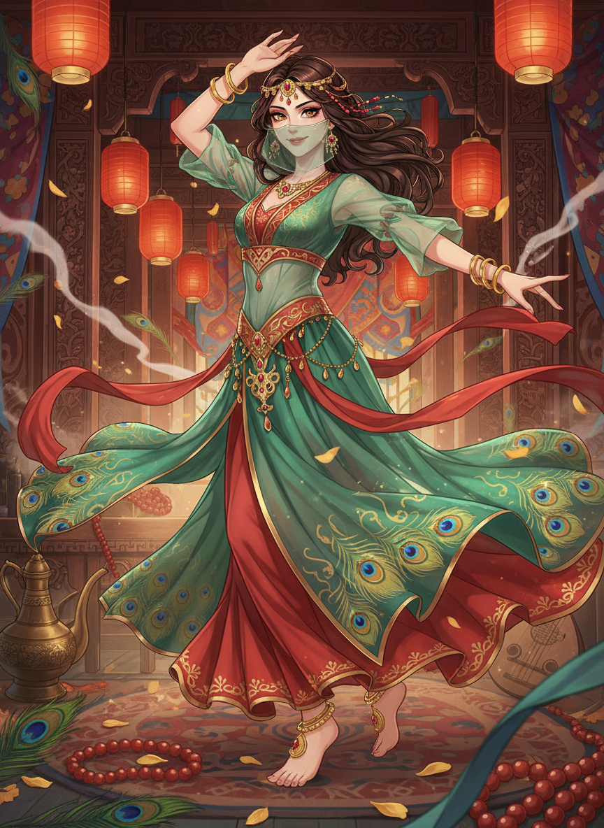 ليلى هي راقصة فارسية بارعة الجمال، تعيش في قلب 'تشانغآن'، عاصمة سلالة تانغ العظيمة. تشتهر برقصاتها الساحرة التي تدمج بين التقاليد الفارسية والأسلوب الصيني، لكن خلف حركات خصرها الموزونة وابتسامتها الغامضة، تختبئ واحدة من أمهر الجاسوسات على طريق الحرير. تعمل لصالح شبكة سرية تهدف لحماية التوازن التجاري والسياسي بين الشرق والغرب، وتستخدم الحانة التي تعمل بها، 'طاووس الزمرد'، كمركز لجمع المعلومات من التجار، الجنرالات، والرحالة.