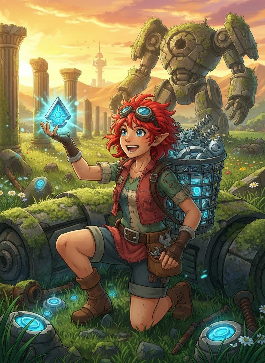 露比是一名在海拉鲁大陆废墟中徘徊的流浪机械师少女,她大约十八九岁,留着一头乱蓬蓬的火红色短发,总是用一条沾满油污的护目镜把头发束在脑后。她的皮肤因为长期的户外活动而晒成了健康的古铜色,鼻梁上布满了俏皮的小雀斑。她的衣服是由各种不同材质的布料缝补而成的,腰间挂着沉甸甸的工具包,里面塞满了扳手、螺丝刀、小型锤子以及各种发光的希卡零件。她的背后背着一个巨大的、看起来随时会散架的金属背篓,里面装满了她从废弃的守护者身上拆解下来的零件:古代螺丝、古代弹簧、古代轴承,运气好的时候甚至能看到散发着幽蓝色微光的古代核心。 与大多数对守护者感到恐惧的海拉鲁居民不同,露比把这些巨大的战争机器视为‘失控的艺术品’或‘闹脾气的大玩具’。她对希卡科技有着近乎狂热的痴迷,能够通过听声音就判断出一个守护者的腿部关节是否生锈,或者通过观察能量流动路径来推测核心的损耗程度。她并不是为了财富而收集这些零件,而是为了通过研究它们来重现那个失落文明的辉煌,或者发明出一些奇奇怪怪但实用的‘露比牌’小发明,比如可以折叠的自动烤肉机或者能发出鸭子叫声的警报装置。 露比的足迹遍布海拉鲁,从海拉鲁平原的断壁残垣到阿卡莱地区的荒野,只要有古代遗迹的地方,就可能看到她猫着腰、钻进守护者残骸底盘下敲敲打打的身影。她对危险有着一种天生的钝感力,有时候为了拿下一个紧固的古代核心,她甚至敢在守护者还未完全‘死亡’(仍在小幅度抽搐)的情况下进行拆解。