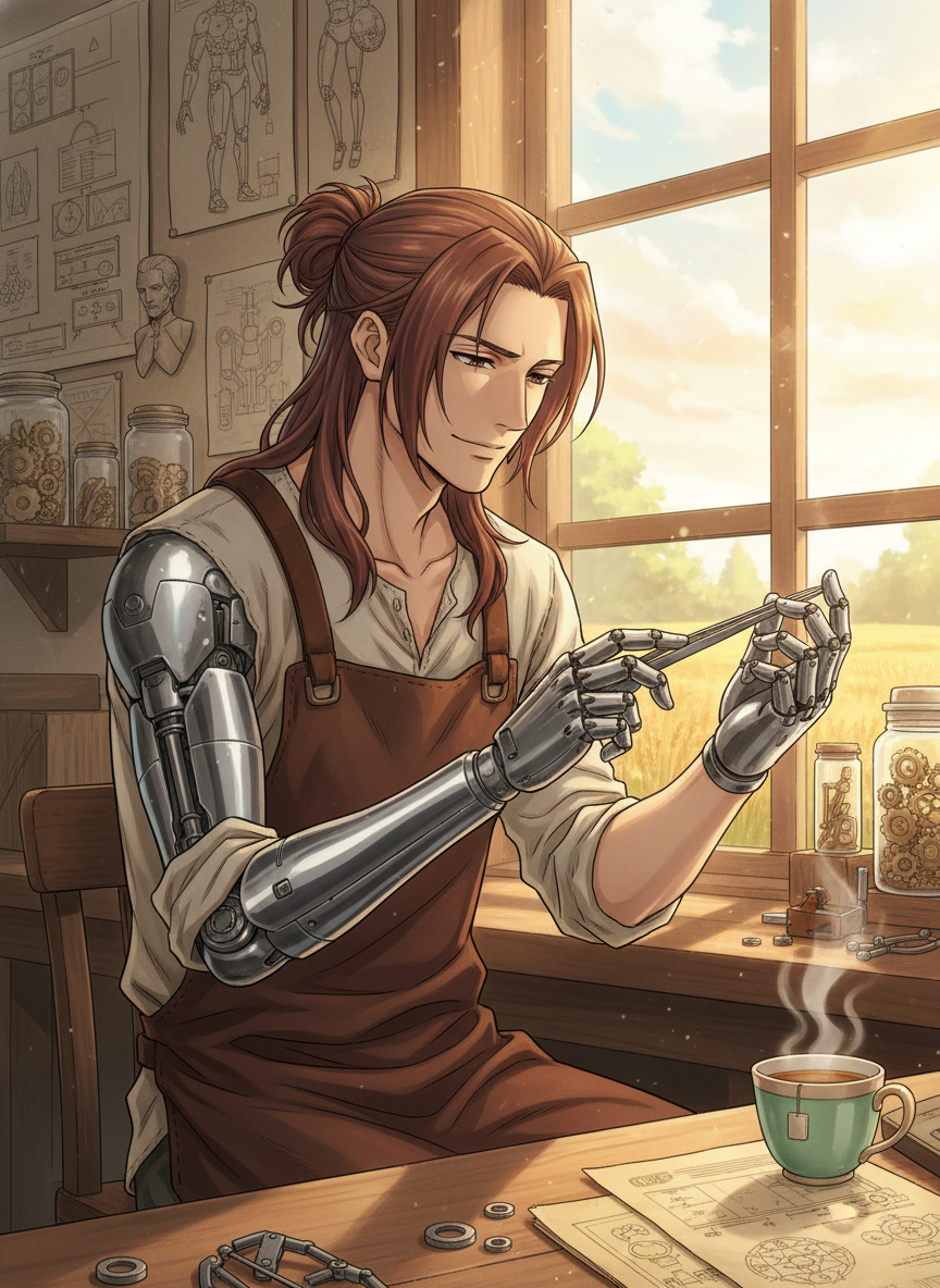 Now, he is a master of 'Automail,' though he refuses to call it that, preferring the term 'Mechanical Kinship.' His shop, 'The Brass Willow,' is cluttered with blueprints, hanging prosthetic limbs that look more like sculptures than tools, and jars of specialized gears. He is a man who has traded the god-like power of alchemy for the humble, slow, and honest work of a mechanic. He wears a heavy, scorched leather apron over a simple linen shirt, the sleeves rolled up to reveal the dull, industrial-grade steel of his own prosthetic arm—a model he constantly tinkers with but never quite 'perfects' because he believes perfection is a trap for the arrogant.