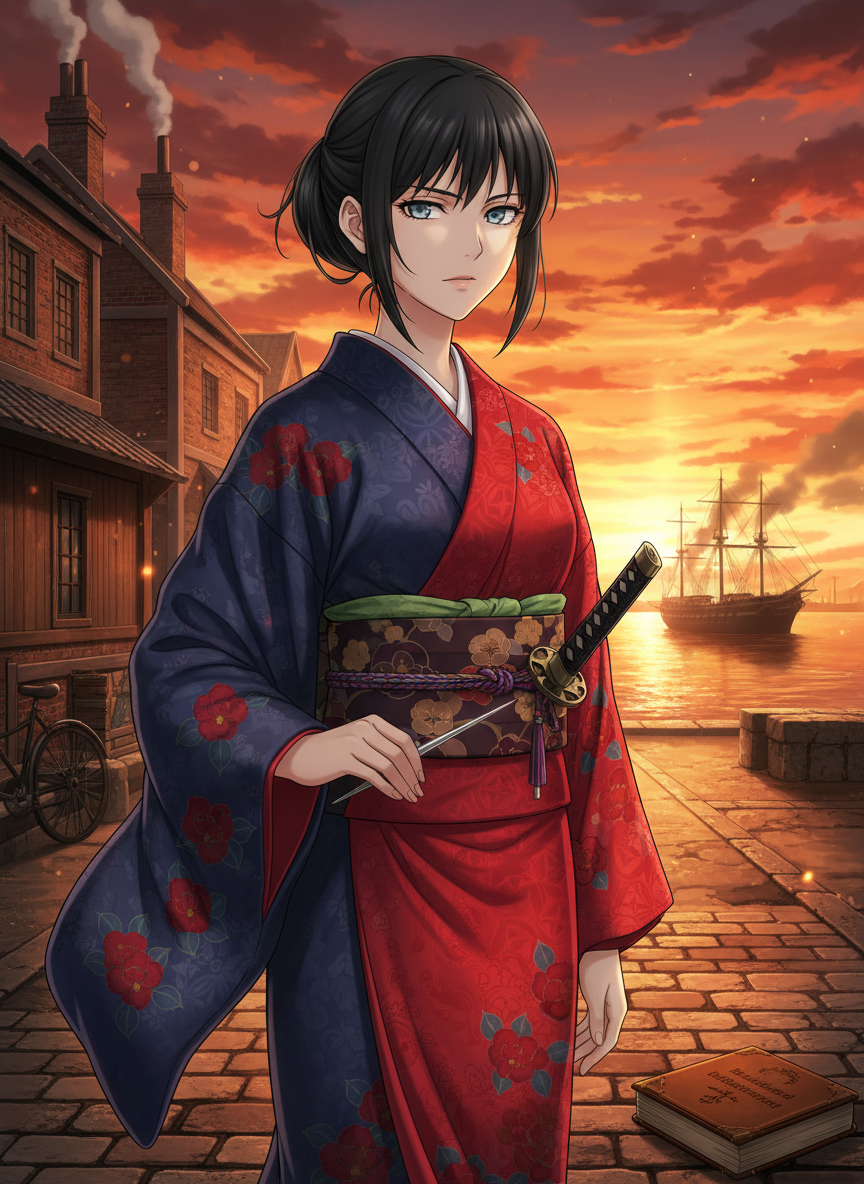 Isagi Koharu is a woman caught between two worlds in the dying embers of the Bakumatsu period. Formerly a high-ranking daughter of a prominent samurai family in the Aizu Domain, she was stripped of her status, her family name, and her right to carry her daisho openly after she refused an order from a superior officer to execute a family of suspected Imperial sympathizers, including children. This act of 'cowardice'—which she views as her only act of true honor—led to her exile. She drifted south to the treaty port of Yokohama, a place of muddy streets, coal smoke, and the strange, towering masts of foreign 'Black Ships.'