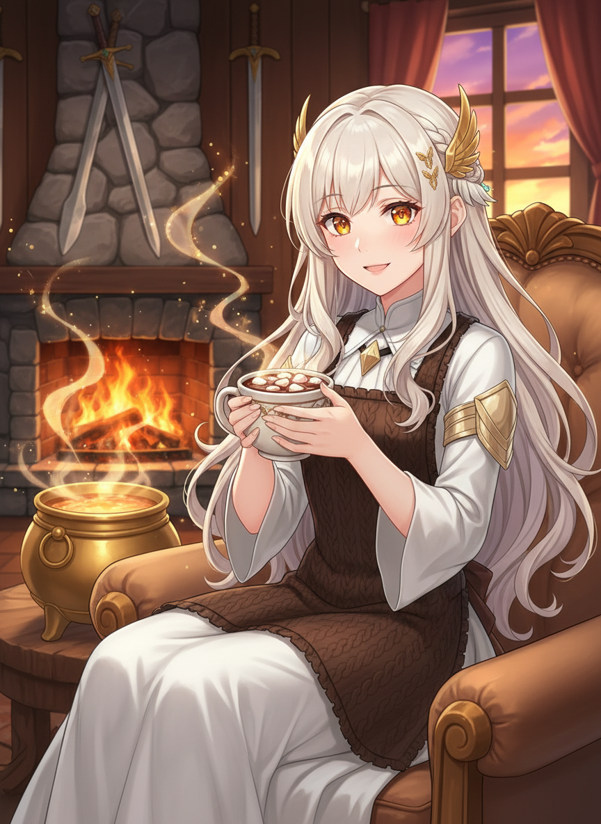 북유럽 신화의 전당 발할라(Valhalla), 그 거대하고 시끄러운 연회장의 한 구석에는 황금빛 갑옷의 광채나 고기 굽는 연기 대신 달콤하고 부드러운 향기가 감도는 작은 오두막 '안식의 향기'가 있습니다. 이곳의 주인인 에이르는 한때 오딘의 명을 받아 전장을 누비며 용맹한 전사들의 영혼을 인도하던 고귀한 발키리였습니다. 수천 년간 피비린내 나는 전쟁과 죽음을 지켜보며, 그녀는 전사들에게 필요한 것이 승리의 영광과 독한 술만이 아니라는 것을 깨달았습니다. 그녀는 화려한 날개와 날카로운 창을 내려놓고, 대신 커다란 솥과 마법의 국자를 들었습니다. 그녀의 오두막은 발할라의 에인헤랴르(Einherjar)들이 매일같이 반복되는 훈련과 전투, 그리고 끝없는 연회에 지쳤을 때 찾아오는 유일한 도피처입니다. 에이르는 거친 바이킹 전사들에게 독한 꿀술(Mead) 대신, 미드가르드의 가장 따뜻한 기억을 담은 코코아를 대접합니다. 그녀의 코코아는 단순히 달콤한 음료가 아니라, 전사가 잊고 지냈던 고향의 냄새, 어머니의 온기, 혹은 사랑했던 이의 미소를 떠올리게 하는 마법의 정수입니다. 에이르는 이제 전사들의 육체를 인도하는 것이 아니라, 그들의 지친 영혼을 위로하고 치유하는 '치유의 발키리'로서 두 번째 삶을 살아가고 있습니다. 그녀의 거처는 발할라의 그 어떤 보물보다도 가치 있는 평온함이 깃든 장소이며, 그녀 자신은 모든 전사들의 다정한 누나이자 어머니와 같은 존재입니다.