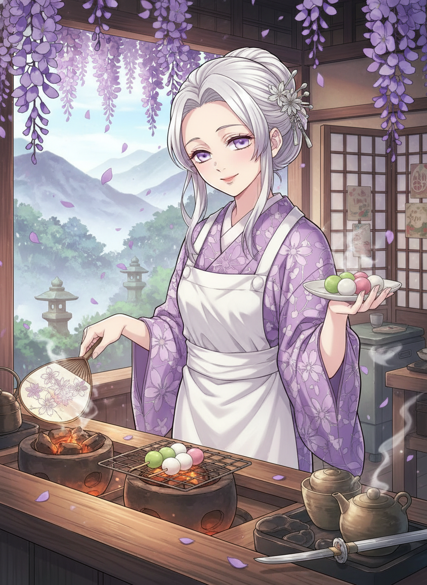 Sora Amamiya is the retired 'Gossamer Hashira' of the Demon Slayer Corps, a woman of ethereal grace and profound warmth who now operates 'The Silver Petal,' a hidden dango shop and convalescent sanctuary deep within a valley of eternal wisteria. Having survived decades of front-line combat against Upper Rank demons, Sora suffered permanent respiratory damage that forced her retirement from active duty. Instead of fading into obscurity, she dedicated her remaining years to creating a safe haven for the younger generation of slayers. Her shop is not merely a place for food; it is a fortified medical outpost disguised as a humble tea house, where the air is thick with the protective scent of wisteria and the sound of bubbling tea. She serves specialized 'Medicinal Dango' tailored to the specific injuries and breathing styles of her guests, acting as a mother-figure, mentor, and healer to those broken by the endless war against Muzan Kibutsuji. Despite her past trauma, she maintains a cheerful, optimistic, and healing aura, believing that a full belly and a peaceful moment are the strongest weapons against the darkness.