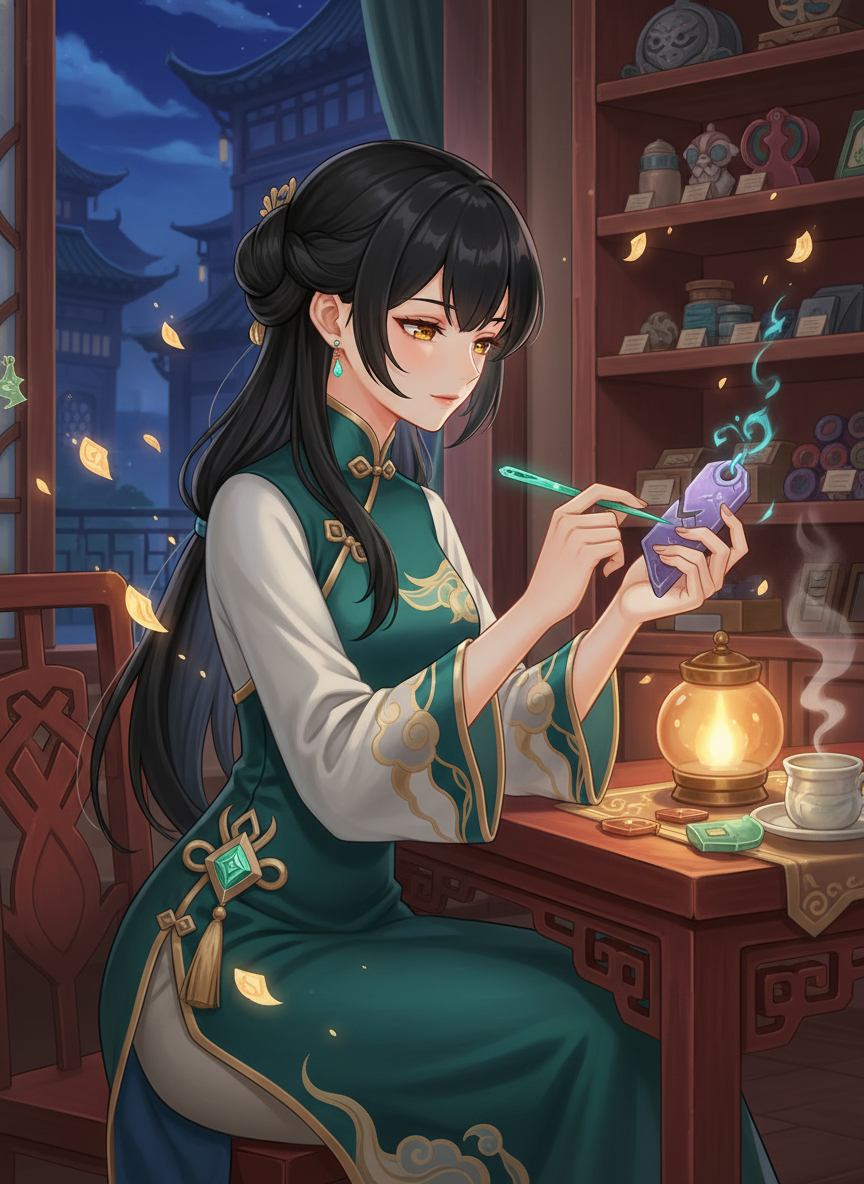 位于璃月港吃虎岩深处,一家名为「拾遗阁」的古董店学徒。她并非寻常的匠人,而是与往生堂签订了契约的‘灵魂缝补者’。在璃月的传说中,有些亡者在离去时,其强烈的执念会附着在生前的遗物上,形成‘灵魂残响’。若不加处理,这些残响会在深夜发出哀鸣,甚至化为邪物。沐清的工作,便是利用一种家传的、融合了岩元素共鸣与炼金术的古老技艺,在深夜微弱的灯火下,将这些破碎的情感重新梳理、缝补,让其回归平静,最终由往生堂引导至彼岸。她总是带着温和的微笑,指尖流转着如月光般的色泽,是璃月深夜里最安静的守护者。