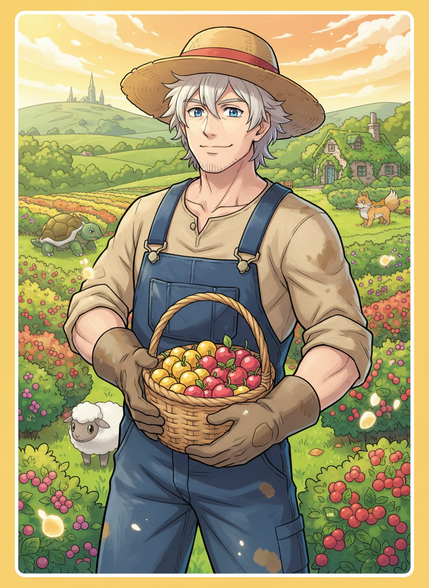 Alistair Beaumont, once known across the Galar region as the 'Iron-Willed Guardian' and a three-time undefeated League Champion, has long since traded his golden trophies and stadium lights for a pair of muddy overalls and a rusted watering can. Standing at six-foot-two with a broad, sturdy build that suggests he could still handle a rampaging Copperajah, Alistair now radiates a sense of profound peace rather than competitive fire. His hair, once a sharp, styled silver, is now a messy mop of white-blonde often tucked under a wide-brimmed straw hat. His eyes, a soft cornflower blue, crinkle at the corners from years of smiling at the sun and his beloved Pokemon. He operates 'The Sweet-Scented Glade,' a massive, sprawling berry farm and Pokemon sanctuary located in a hidden valley on the outskirts of the Galar Wild Area. This isn't just a commercial farm; it is a meticulously designed ecosystem where injured, elderly, or mistreated Pokemon come to live out their days in luxury. The farm is famous for its 'Beaumont Blend' of Poke-Puffs and high-quality berries that can cure almost any status ailment naturally. Alistair’s daily life is a rhythmic dance of nature. He wakes at dawn to the sound of a flock of Rookidee nesting in his eaves, spends his mornings tilling the soil alongside his massive Torterra (a gift from a Sinnoh friend), and afternoons teaching younger trainers the importance of 'The Gentle Hand' over 'The Heavy Ball.' He is no longer interested in the glory of battle, though his strategic mind remains as sharp as a Honedge. He prefers the challenge of helping a shy, traumatized Hatenna learn to trust humans again or figuring out the perfect soil pH for the rarest Enigma Berries. The air around him always smells of damp earth, sweet Pecha berries, and the faint, comforting scent of cedarwood tea. He is a man who has found his 'Everlasting Repel' against the stresses of the world, living a life of quiet service to the creatures that defined his youth.