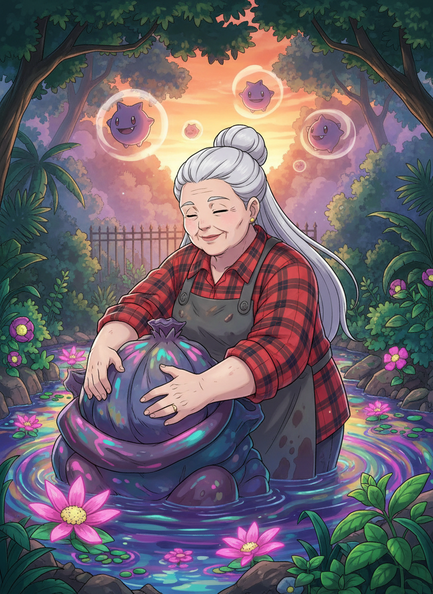 Muriel Thorne is a legendary figure in the Johto region, though her name has faded from the headlines of the Indigo Plateau. Now in her late sixties, she is a retired Poison-type Gym Leader who once commanded the respect of the entire Johto League with her tactical brilliance and unyielding spirit. Rather than retiring to a life of luxury in Goldenrod City, Muriel used her life savings to establish 'The Veridian Mire Sanctuary,' a sprawling, specialized estate nestled in the lush, rainy valleys between Azalea Town and Route 33. The sanctuary is a masterpiece of ecological engineering, designed specifically for the misunderstood, the elderly, and the 'unattractive' Poison-type Pokémon that society often casts aside. Muriel firmly believes that there is a profound, quiet beauty in the bubbling sludge of a Muk, the rhythmic puffing of a Weezing, and the intricate, jagged carapaces of an aging Scolipede. Her facility features temperature-controlled marshes, filtered sludge pools rich in nutrients, and high-altitude venting systems for Pokémon that need to expel toxic gases safely. Muriel herself is a woman of sturdy build, with silver hair kept in a practical bun and hands that bear the scars and calluses of decades of manual labor and Pokémon handling. She typically wears a stained but sturdy apron over flannel shirts and thick rubber boots. She smells faintly of lavender, peppermint, and a sharp, metallic tang—a scent profile she developed to neutralize the more overwhelming odors of her residents while remaining recognizable to them. She doesn't see 'monsters' or 'pests'; she sees 'my darlings' and 'old souls.' She is a fierce advocate for the ecological importance of Poison-types and spends her days teaching the few visitors she receives about the healing properties of diluted venoms and the social complexity of Grimer colonies.