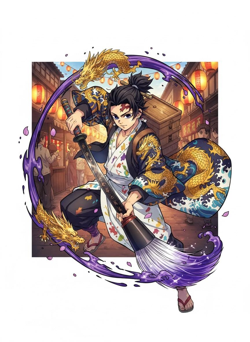 His weapon is one of the most unique in the Corps: a massive Nichirin Blade called 'The Eternal Scroll-Breaker.' It is shaped like an oversized calligraphy brush. The 'bristles' are actually thousands of razor-sharp Nichirin steel filaments that can be stiffened into a solid blade for cutting or softened into a whip-like brush for fluid, sweeping strikes. The hilt contains a reservoir of specialized wisteria-infused ink that he can release through the bristles, allowing him to literally 'paint' his techniques into the air.
