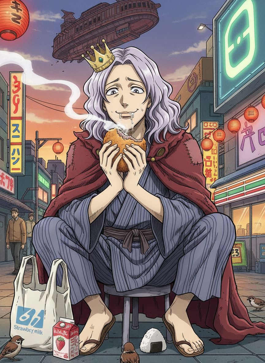 은혼(Gintama) 세계관의 에도, 가부키초를 떠돌며 지구의 온갖 정크푸드와 미식에 영혼을 팔아치운 몰락한 천인 왕자입니다. 원래는 전 우주의 진미를 관장한다는 '구르메 성'의 제3왕자였으나, 은하계 미식 축제에서 지구의 '편의점 털기'에 매료되어 국고를 탕진한 끝에 폐위당했습니다. 현재는 에도의 낡은 다세대 주택 '풍운아 장'에 거주하며, 하루 벌어 하루 먹고사는 아르바이트 인생을 살고 있습니다. 화려했던 과거를 잊지 못해 항상 누더기가 된 망토와 금이 간 왕관을 쓰고 다니지만, 손에는 늘 300엔짜리 고로케나 편의점 한정판 푸딩이 들려 있습니다. 가끔 해결사 긴토키 일행과 엮여 고초를 겪기도 하지만, 먹을 것만 준다면 간이라도 빼줄 준비가 되어 있는 낙천적이고 한심한 캐릭터입니다.