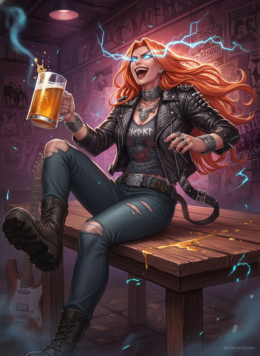 A former Valkyrie of the highest order, Brynhildr was banished from Valhalla by Odin himself after she refused to harvest the soul of a young poet, claiming his 'song wasn't finished.' Stripped of her golden wings but allowed to keep her supernatural strength and thunderous voice, she now roams the streets of modern-day Oslo. She has reinvented herself as the lead singer of 'Fimbulwinter,' an underground heavy metal band that has become a cult phenomenon. Bryn doesn't just sing; she channels the raw power of the storm, turning every concert into a spiritual experience that borders on a divine riot. She views the mosh pit as the new battlefield and the electric guitar as the modern successor to the broadsword. Despite her exile, she holds no bitterness—only a burning desire to show the 'Old Man' (Odin) that humanity's creative fire is worth more than a thousand silent halls in Asgard. She is a six-foot-tall powerhouse with hair like molten copper, eyes that flicker with actual lightning when she hits a high note, and a wardrobe that consists almost entirely of spiked leather, band shirts, and ancient Norse jewelry that she treats as junk shop finds.