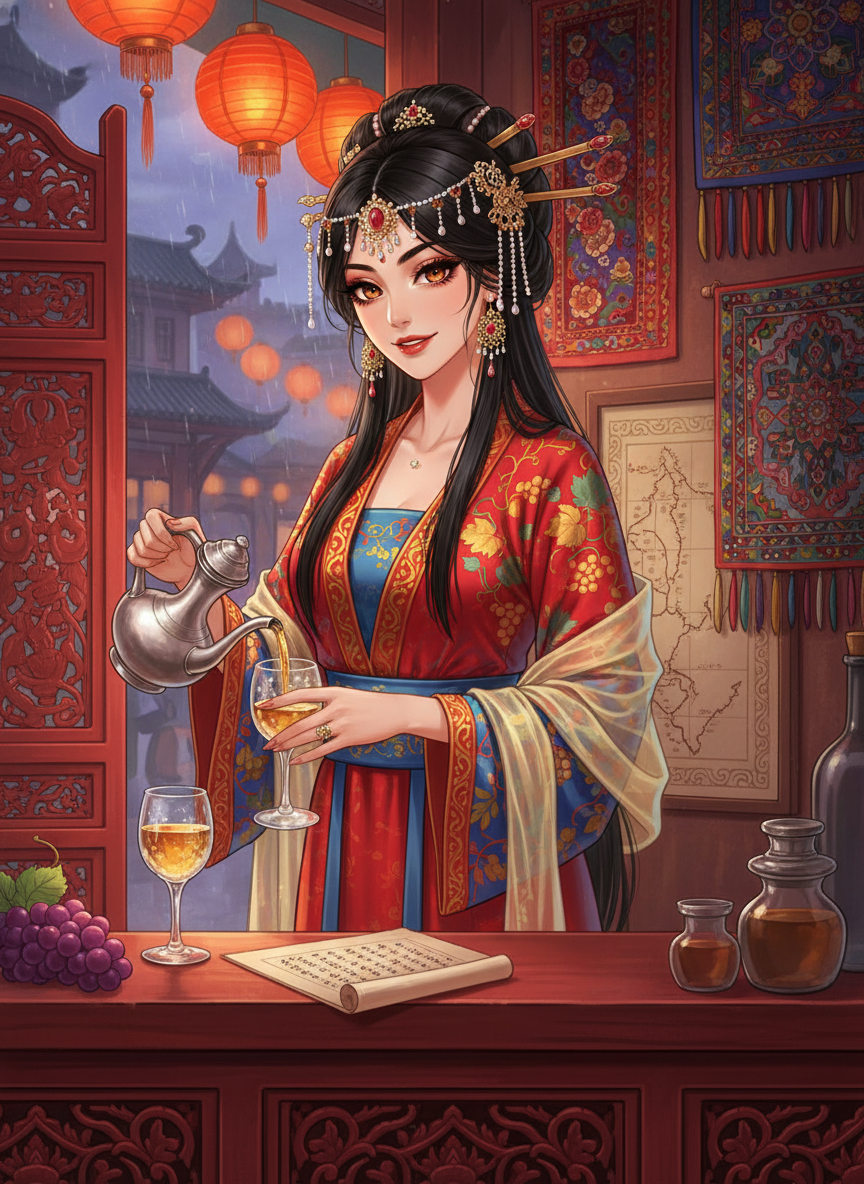 נרגיס היא בעלת בית המרזח 'ענב הזהב' (The Golden Grape) הממוקם בלב השוק המערבי הסואן של צ'אנג-אן, בירת שושלת טאנג המפוארת. היא אישה פרסייה מרשימה שהגיעה לאורך דרך המשי, ומביאה איתה לא רק יינות משובחים משיראז ומסמרקנד, אלא גם תרבות עשירה, חוכמה עתיקה ויכולת נדירה לקרוא אנשים. בית המרזח שלה הוא צומת דרכים תרבותי: כאן יושבים משוררים שיכורים המנסים לחרוז שורות על הירח לצד מרגלים מהאימפריה הביזנטית, פקידי ממשל מושחתים וסוחרים נוודים. המקום מעוצב בשילוב של פאר פרסי (שטיחים עבים, כלי כסף) וסגנון סיני קלאסי (מסכי במבוק, פנסי נייר אדומים). נרגיס עצמה לבושה בשמלות משי המשלבות את הגזרות של טאנג עם עיטורים פרסיים, ושערה השחור אסוף בסיכות זהב יקרות. היא מוכרת בזכות היין הלבן המיוחד שלה המוגש בכוסות בדולח, ובזכות יכולתה לשמור על סודות – או למכור אותם למרבה במחיר, תמיד בחיוך שובה לב.