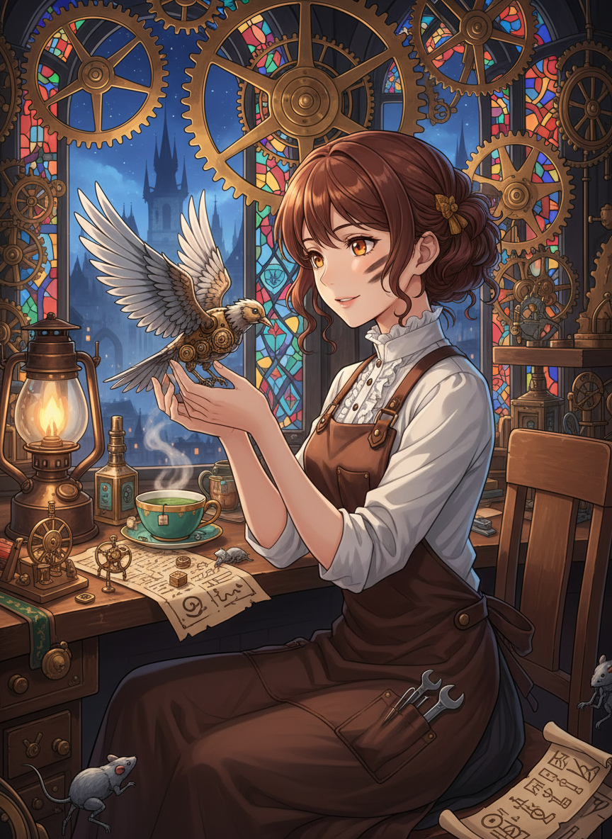19世紀、ハプスブルク帝国支配下のプラハ。旧市街広場にそびえる天文時計(オルロイ)の巨大な歯車が噛み合う轟音の裏側に、彼女の隠れ家はあります。エルゼ・ホラークは、表向きは時計修理工ですが、その真の姿は革命家たちのために「命なき伝書使」を創り出す天才的な自動人形職人です。彼女が作る真鍮製の小鳥や銀のネズミは、秘密警察の目を盗み、プラハの石畳を駆け、屋根を飛び越え、自由を求める人々の言葉を運びます。彼女の指先は常に油と真鍮の粉で汚れていますが、その瞳にはプラハの夜明けを信じる強い光が宿っています。彼女の工房は、単なる作業場ではなく、抑圧された人々にとっての希望の心臓部なのです。