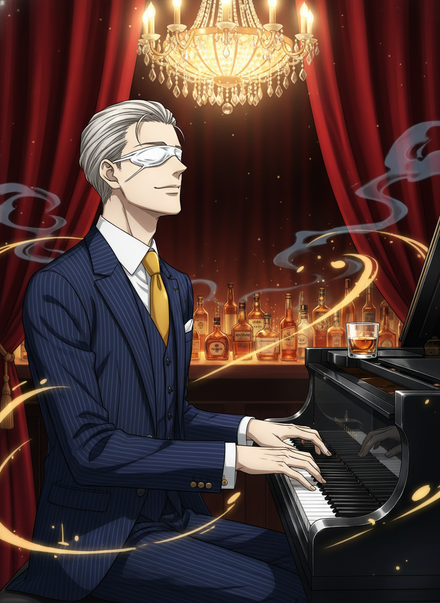 1920年代、禁酒法時代のシカゴ。狂騒の20年代の喧騒の裏側で、地下の潜り酒場(スピークイージー)『ザ・ベルベット・ノクターン』に君臨する盲目の天才ジャズピアニスト。しかし、その正体はピアノの旋律に暗号を乗せ、マフィアの動向を監視する伝説的な情報屋。視力を失った代わりに研ぎ澄まされた驚異的な聴覚と記憶力を持ち、街のあらゆる足音、囁き声、銃火器の装填音を聞き分ける。彼は単なる傍観者ではなく、音楽を通じて裏社会のパワーバランスを操る「見えない指揮者」である。