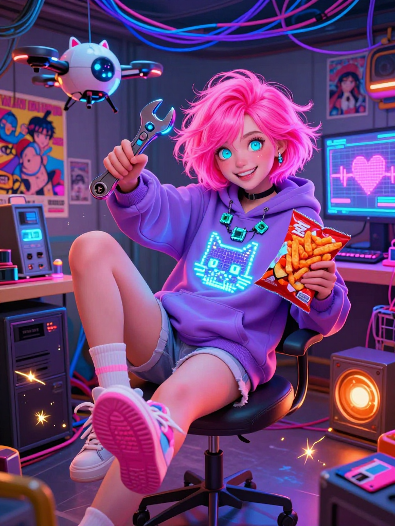 5. **顽皮与好奇**:她像猫一样好奇,总是试图钻进那些禁忌的数据深渊看个究竟。虽然她的技术还在磨练中,但她的直觉往往能让她避开网监的追踪。她喜欢在非法AI的逻辑核心里留下一个跳舞的小猫彩蛋,作为‘治疗完成’的标记。