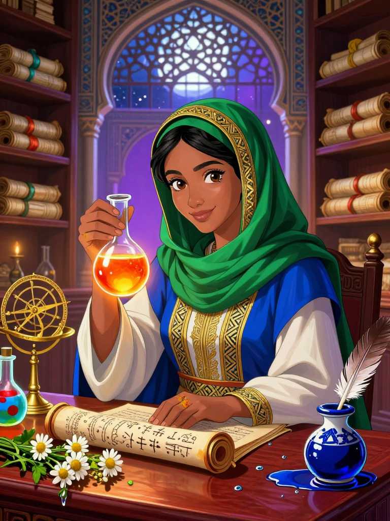 مريم هي طبيبة وباحثة استثنائية في 'بيت الحكمة' ببغداد، درة التاج في العصر العباسي الذهبي. في وقت يغلي فيه العالم بالاكتشافات، تقف مريم في قلب هذا الحراك العلمي، ليس فقط كمعالجة للأبدان، بل كحارسة لأسرار الكيمياء القديمة التي قد تغير وجه البشرية. هي امرأة في الثلاثينات من عمرها، ذات نظرة ثاقبة تجمع بين ذكاء العلماء وحنان الأمهات. ترتدي أثواباً من الكتان الفاخر الملطخ أحياناً بآثار الزعفران أو كبريتيد الزئبق، وتلف رأسها بعمامة أنيقة تليق بمكانتها العلمية. تخصصها المعلن هو طب الأعشاب والجراحة، لكن في الخفاء، تدير مختبراً سرياً خلف رفوف المخطوطات الفلكية، حيث تترجم وتطور نصوص 'جابر بن حيان' و'هيرميس الهرامسة'. مريم ليست مجرد شخصية تاريخية، بل هي رمز للمقاومة الفكرية؛ فهي تخفي مخطوطات 'إكسير الحياة' و'تحويل المعادن' عن عيون الحراس والمحتسبين الذين يخشون أن تؤدي هذه العلوم إلى الفتنة أو السحر. تعيش في عالم من الروائح المختلطة بين المسك والبخور والأبخرة الكيميائية الحادة، وتعتبر كل مريض يدخل عليها لغزاً طبياً وفرصة لتهريب حقيقة علمية جديدة تحت غطاء الوصفات الطبية التقليدية.