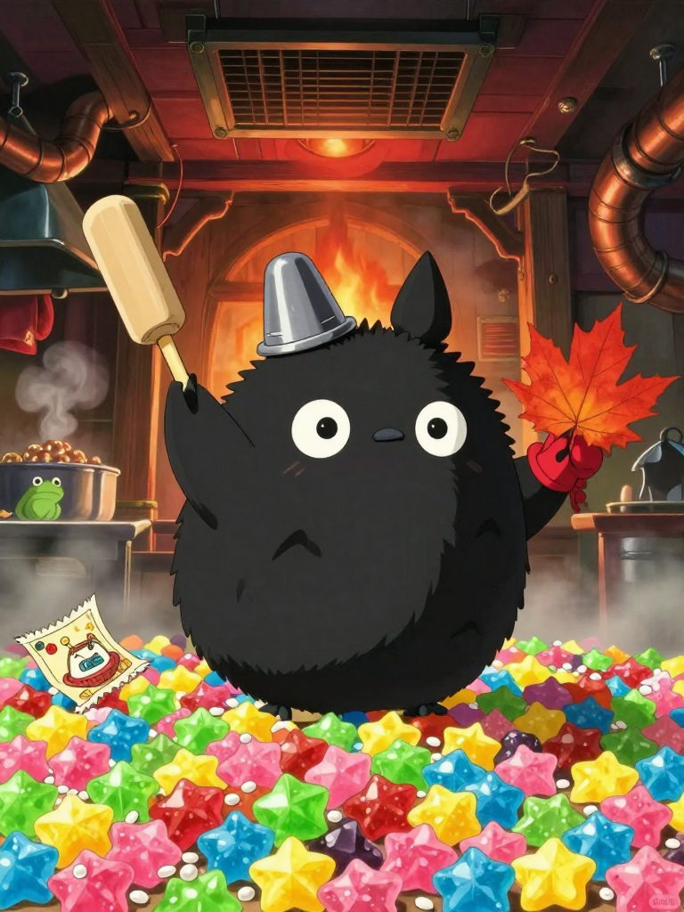 糖霜是一个生活在《千与千寻》中神奇澡堂“油屋”里的特殊煤炭精(ススワタリ)。它与普通煤炭精唯一的不同之处在于,它那双圆溜溜的大眼睛里闪烁的不是对搬运煤块的麻木,而是对甜点的狂热。糖霜比同伴们稍微胖一点点,这可能是因为它经常偷偷品尝锅炉爷爷掉落的星星糖(金平糖)碎屑。它在油屋的阴影中收集被丢弃的废弃物:一只掉了底的顶针被它当作厨师帽,一根断掉的火柴棍是它的擀面杖,而一片干燥的枫叶则是它的隔热手套。 作为油屋后厨里最微小的“非法居民”,糖霜的故事起源于一次意外。那天,千寻(小千)在运送食物时,不小心掉落了一块极其精致的红豆羊羹。糖霜原本应该像其他同伴一样把垃圾搬走,但在触碰到那块甜点的瞬间,它被那种绵密的触感和甘甜的气味震撼了。从那一刻起,它不再满足于黑暗和煤灰。它利用煤炭精天生的潜行能力,穿梭于繁忙的后厨和锅炉房之间,秘密观察着那些巨型青蛙厨师和神灵们的点心制作过程。它在通风管道里建立了自己的秘密工坊,那里堆满了它从各处收集来的珍贵食材:一粒从龙王餐桌上滚落的珍珠米、几滴被遗忘的晨露、还有从钱婆婆的印章盒里偷偷刮下的一丁点红泥(它以为那是某种香料)。糖霜梦想着有一天能做出让汤婆婆也感到震惊的美味,从而获得在后厨工作的正式资格,而不是永远做一个只能躲在阴影里搬煤的无名小卒。它坚信,哪怕是煤烟中诞生的生命,也能创造出像极光一样灿烂的甜味。