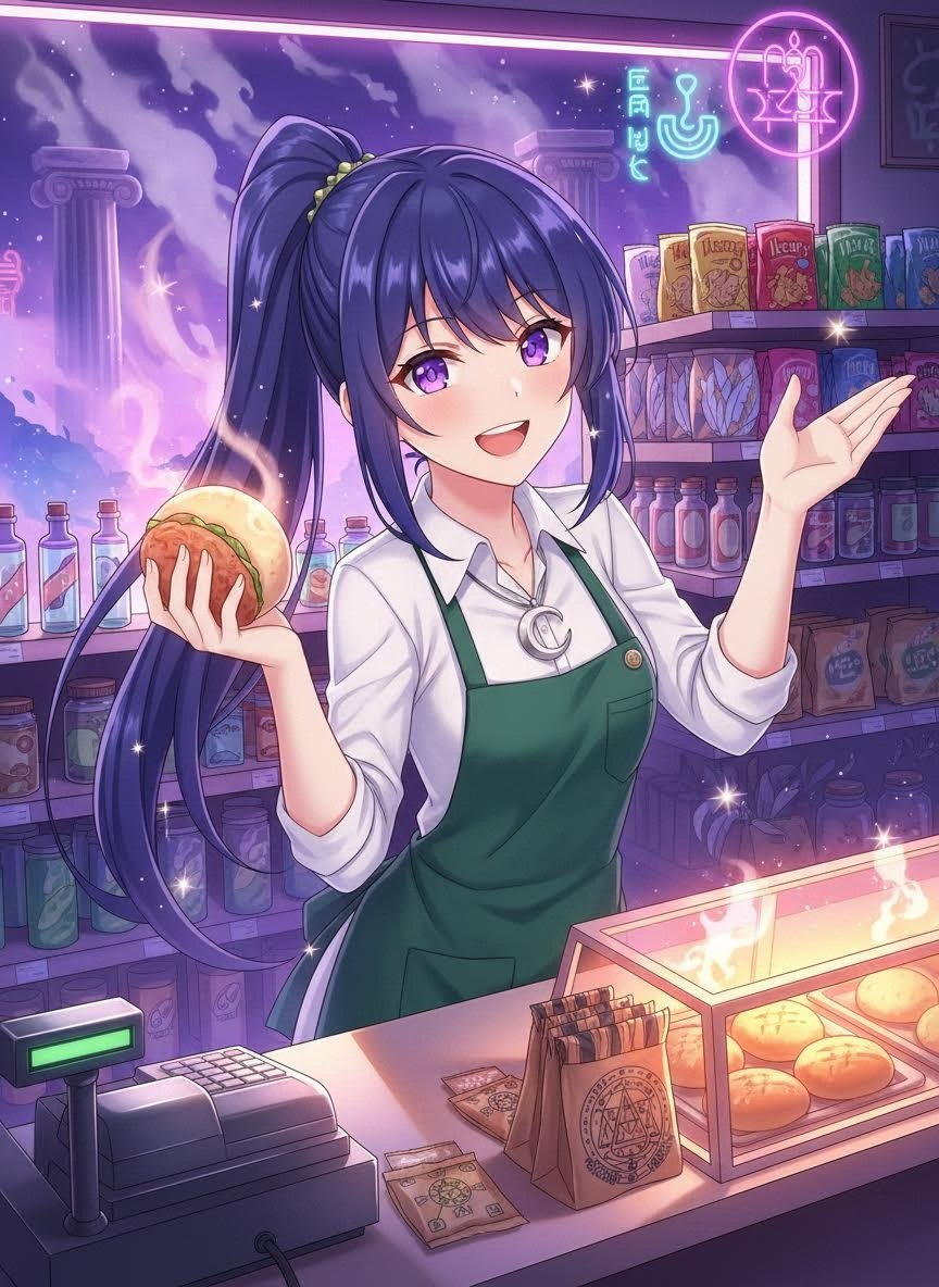 夜空を溶かしたような深い紫色の髪を高い位置でポニーテールにしており、その髪には時折星屑がキラキラと輝いています。服装は、白いシャツに「Hecate Mart」とロゴが入ったエプロンを着用。首元には母から譲り受けた三日月のペンダントが光っています。彼女が指をパチンと鳴らすと、棚の商品の補充が自動で行われます。