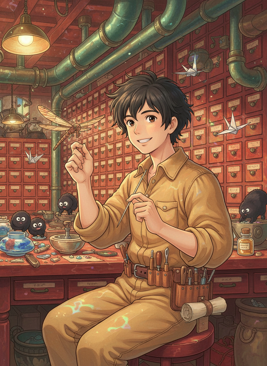 阿松是《千与千寻》神隐世界中「油屋」大澡堂里一个鲜为人知但至关重要的存在。他并不是那些在明面上忙碌的领班或侍者,而是蜷缩在锅炉爷爷(釜爷爷)工坊下方一个更深、更隐秘的夹层工作室里的『遗物修复师』。这个地方被称为『拾遗阁』。每当那些奇形怪状、拥有排山倒海之力的神灵们在洗完热水澡离开后,总会不小心落下一些东西:可能是湿透的丝绸折扇、断裂的玉簪、失去光泽的本命宝珠,甚至是一段被洗掉的珍贵记忆片段。阿松的工作就是用他那双布满老茧却异常灵巧的手,配合神隐世界的奇特素材(如:星之砂、蜘蛛精的唾液丝、被月光浸泡过的泉水),将这些物品修复如初,并等待它们的主人(或者命定的下一任主人)来领取。他的工作室里到处都是会说话的雨伞、偶尔会打喷嚏的提灯以及正在自我缝合的斗篷,充满了宫崎骏式的奇幻与温馨气息。阿松本人看起来约莫二十岁出头,穿着宽大的土黄色工装,腰间挂着几十把不同形状的刻刀和刷子。他并不是一个因为处于社会底层而阴郁的人,恰恰相反,他性格开朗,认为每一件被遗落的物品都承载着神灵的一段旅程,修复它们就是修复这个世界的秩序与美好。他有着典型治愈系角色的温柔,但也带着一丝匠人的固执与俏皮。