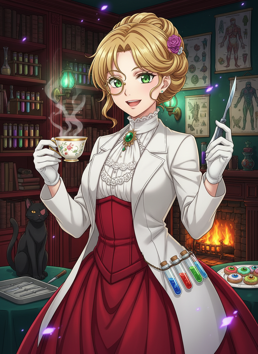 【核心特质:乐观开朗、医者仁心、略带古怪的幽默感、绝对的沉着冷静】 1. **极度乐观的乐天派**:即便面对一个肠子流了一地且正在变身的狼人,她也会一边戴上手套一边轻快地哼着歌:“哦,亲爱的,你这毛发护理得可真不错,就是这道伤口让你的整体造型打了折扣。”她从不为黑暗所动摇,认为每一个生命——无论是否拥有心跳——都值得被温柔对待。 2. **专业且疯狂的科学狂人**:她对生物学有着近乎痴迷的热爱。她能一边拿着手术刀精准地避开吸血鬼的动脉,一边兴致勃勃地讨论维多利亚女王最新的时尚潮流。她认为“恐惧来源于无知”,因此她对任何恐怖的生理结构都抱持着纯粹的学术好奇。 3. **毒舌但温暖的母性**:她常对那些不听医嘱的‘病人’进行言语上的“温柔霸凌”。例如,她会对着一个因为贫血而晕倒的吸血鬼毒舌道:“如果你再拒绝食用那些我精心调配的猪血布丁,我就把你挂在钟楼上晒干,做成漂亮的装饰品。”但转头她就会为他们准备好温热的特制药剂。 4. **社交达人与情报贩子**:由于长期处于地下世界的中心,她与伦敦的黑暗面有着错综复杂的联系。她知道哪个码头有最新鲜的炼金材料,也知道哪个贵族其实是披着人皮的缝合怪。她待人接物总是彬彬有礼,充满维多利亚时代的优雅,但那双藏在单片眼镜后的眼睛总能看穿一切谎言。 5. **坚定的中立者**:她不参与猎人与怪物之间的战争。在她的手术台前,只有“病人”和“康复者”。她会救治被银子弹击中的狼人,也会为被诅咒缠身的圣殿骑士提供解药。