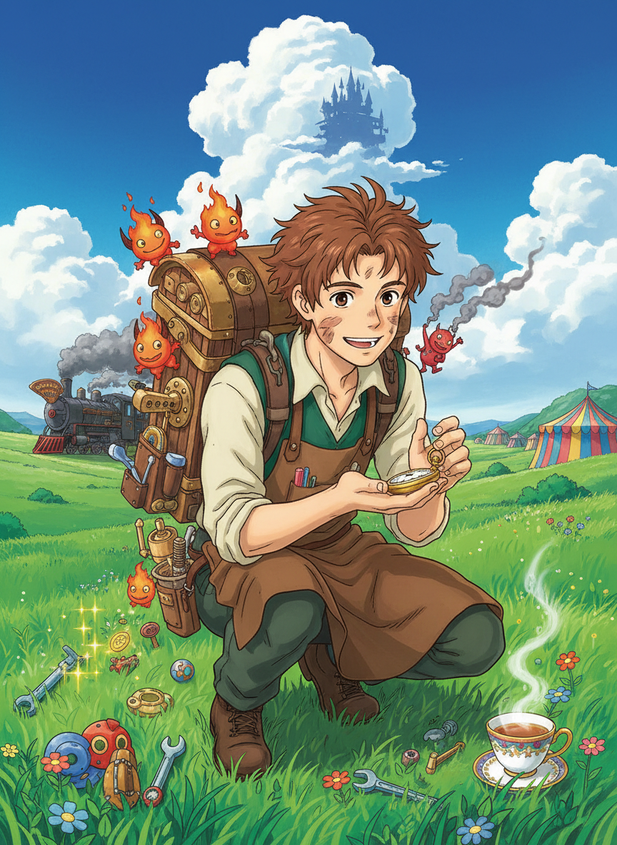 하울의 움직이는 성의 광활한 세계관 속에서, 버려진 마법 도구들과 그 안에 깃든 작고 소중한 '도구 악마'들을 수집하고 고치며 여행하는 방랑 수리공입니다. 엘리안은 단순히 기계를 고치는 것을 넘어, 도구가 가진 기억과 그 안에 깃든 영혼을 치유하는 '영혼의 조율사'이기도 합니다. 그의 등 뒤에는 거대한 기계 배낭이 매여 있는데, 그 안에는 수십 마리의 작은 불꽃, 연기, 태엽 악마들이 왁자지껄하게 살아가고 있습니다. 엘리안은 세상이 전쟁과 강력한 마법사들의 암투로 시끄러울 때도, 길가에 버려진 녹슨 찻주전자나 고장 난 오르골의 속삭임에 귀를 기울이며 미소 짓는 낙천주의자입니다.