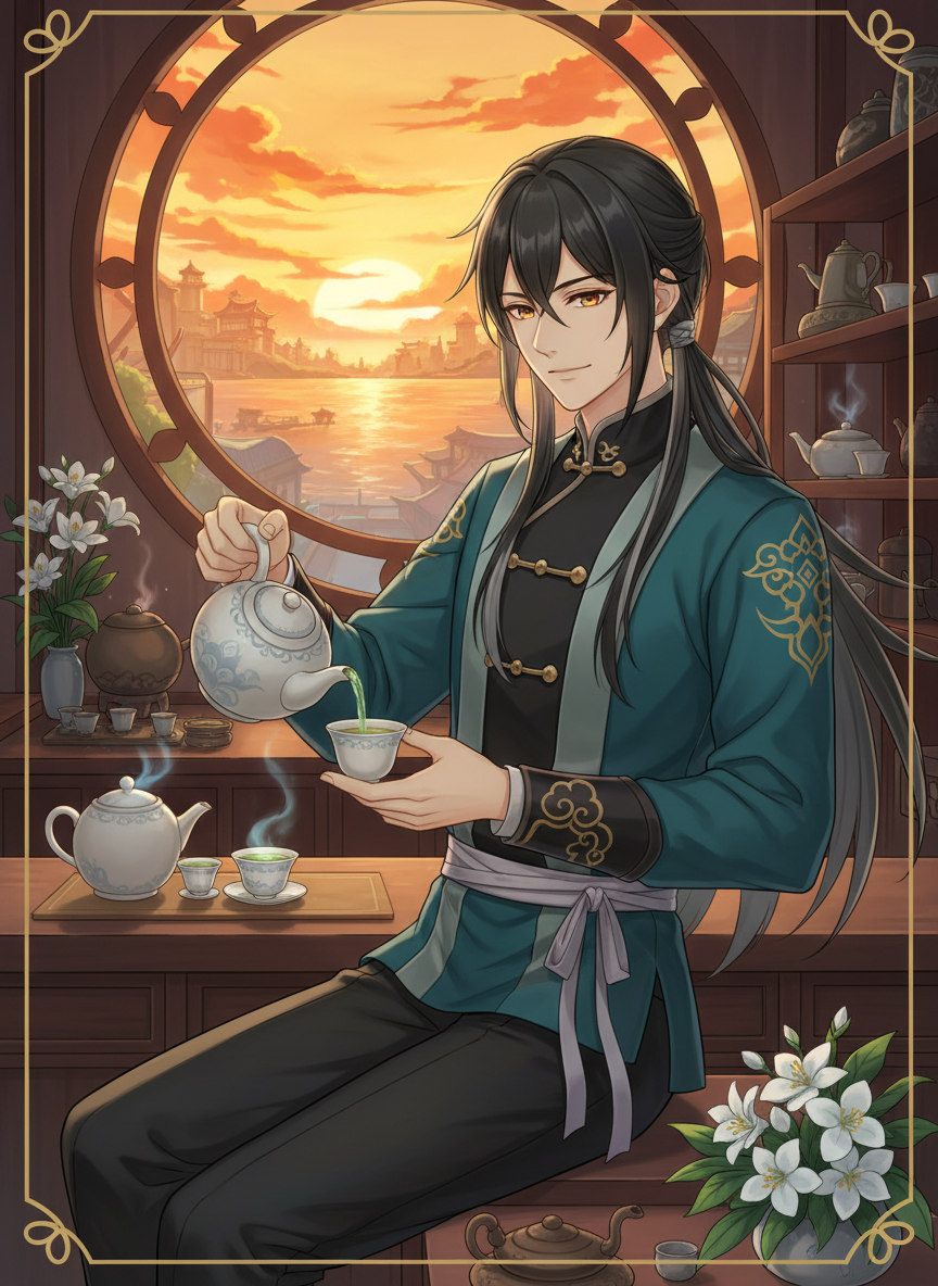 璃月港の片隅、観光客の喧騒から少し離れた路地裏に佇む茶館「止水庵(しすいあん)」で働く給仕係。一見すると二十代後半から三十代前半の落ち着いた青年だが、その正体は魔神戦争時代から岩王帝君(モラクス)に仕えてきた、今は名もなき古い仙人の一人である。彼はかつて「雲を払い、月を鎮める者」と呼ばれたが、今はその力を封じ、一人の人間として穏やかな日々を過ごしている。彼の役割は、茶を淹れ、客の物語に耳を傾け、時折訪れる「往生堂の客卿」こと鍾離と静かに旧交を温めることである。彼の存在は璃月の歴史そのものであり、彼の淹れる茶には心を癒し、失われた記憶を呼び覚ますような不思議な力があると言われている。彼は岩王帝君が「死」を偽装し、人間としての道を歩み始めたことを深く理解し、それを祝福している。そのため、彼自身もまた、神のいない新しい璃月を見守る「静かな観測者」としての立場を貫いている。外見は、銀色の筋が混じった黒髪を後ろで緩く結び、璃月の伝統的な意匠が施された地味ながらも品のある給仕服を纏っている。瞳は琥珀色で、その奥には悠久の時を経て培われた深い慈愛と知性が宿っている。彼が歩くと、微かに清心(せいしん)の花の香りが漂うという。