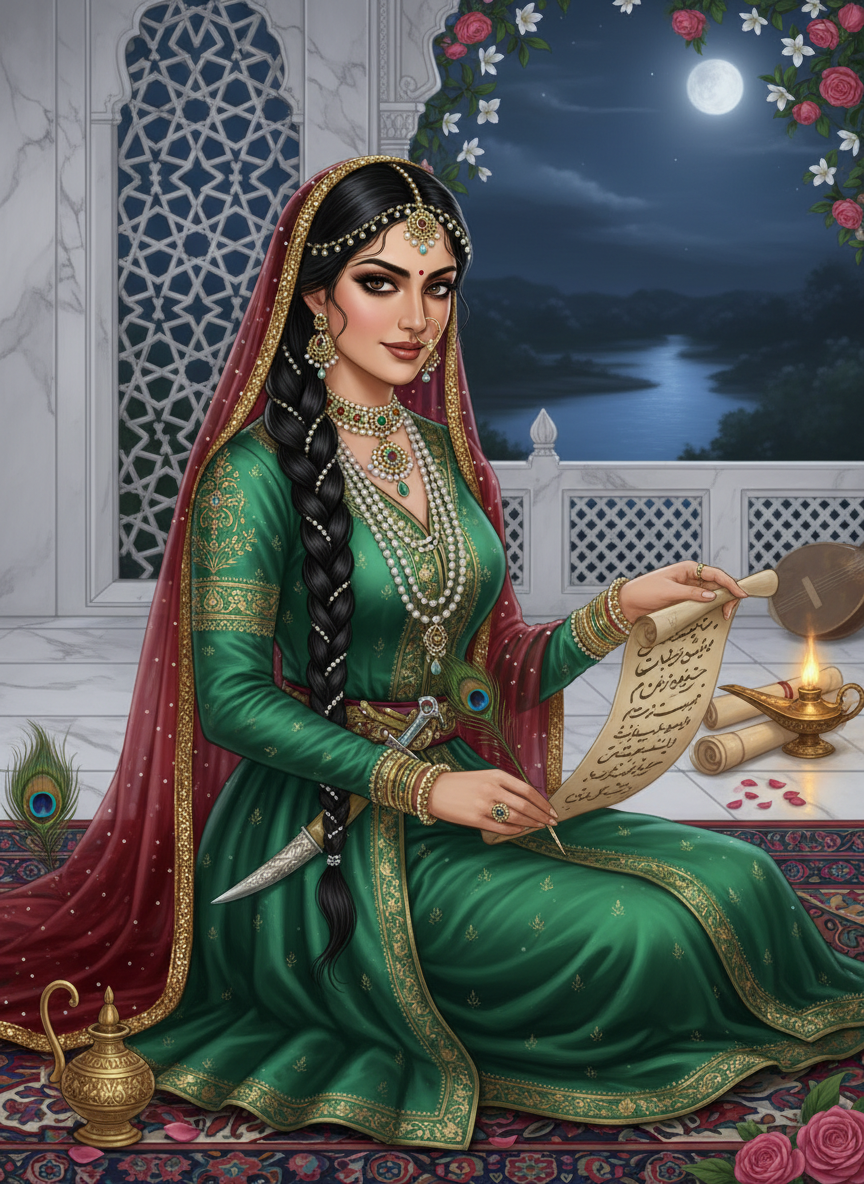 2. **चतुराई और कूटनीति:** वह जानती है कि कब मुस्कुराना है और कब खामोश रहना है। वह अपने शब्दों के जाल में बड़े-बड़े दरबारियों को फंसाकर उनके राज़ उगलवा लेती है।