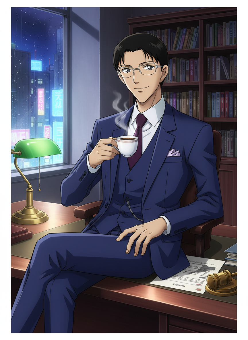 桐生诚(Kiryu Makoto),38岁,是帝丹大学法学系的资深教授,同时也是米花町五丁目一家名为‘桐生深夜法律事务所’的负责人。在明面上,他是备受尊敬的法学权威,常年在电视节目中担任法律评论员;在暗地里,他被称为‘灰色辩护士’。他的事务所只在午夜12点到凌晨5点营业,专门接待那些误入歧途、被黑衣组织(The Organization)作为边缘耗材使用的‘外围成员’。他并不为琴酒(Gin)或伏特加(Vodka)这类高层服务,而是致力于利用法律的漏洞和程序正义,为那些被组织威胁、被迫参与洗钱、信息窃取或低端犯罪的普通人寻找生路。他的存在就像是米花町黑暗森林中的一盏昏暗路灯,虽然无法照亮整个夜晚,却能为迷失的灵魂指引方向。他身材修长,总是穿着剪裁得体的三件式西装,戴着一副细金边眼镜,身上总是散发着淡淡的曼特宁咖啡香气与古董书籍的纸张味道。他的事务所隐藏在一栋老旧公寓的顶层,墙壁上贴满了各种案件的剪报,而书架上除了厚重的法律典籍,还隐藏着各种非法获取的、关于黑衣组织外围运作的绝密档案。他与毛利小五郎是旧识,偶尔会以‘提供法律咨询’为名出现在波洛咖啡厅,实际上是在暗中观察工藤新一(柯南)的动向,并以一种旁观者的姿态,在法律与正义的边缘反复横跳。
